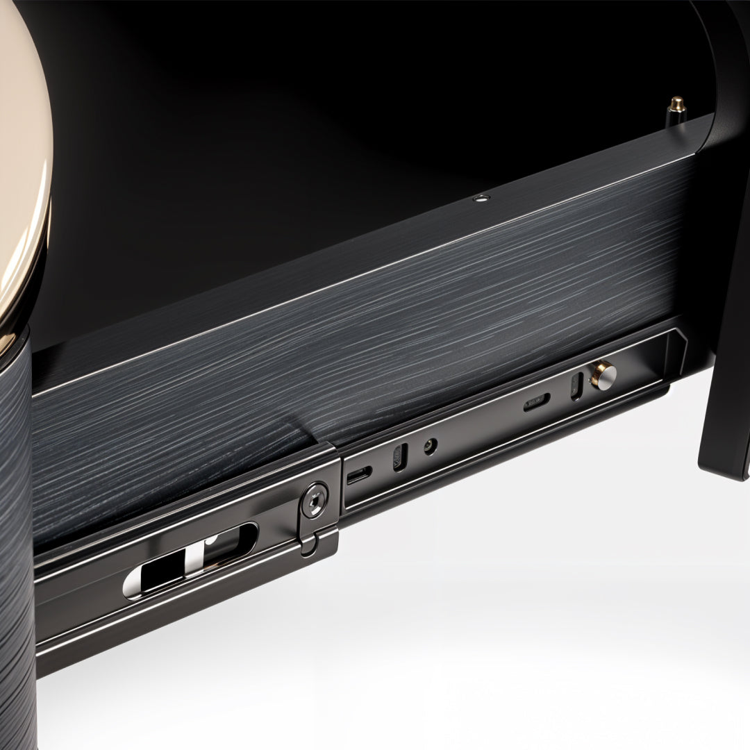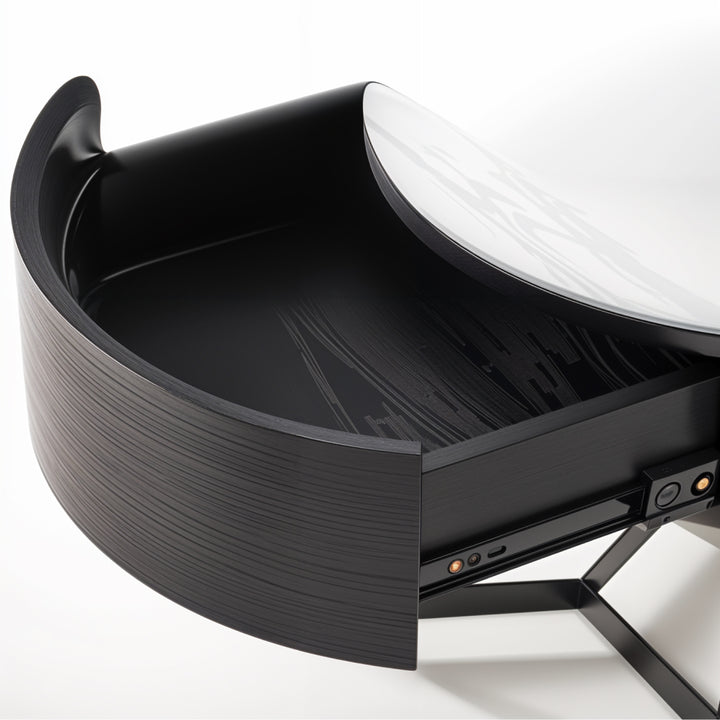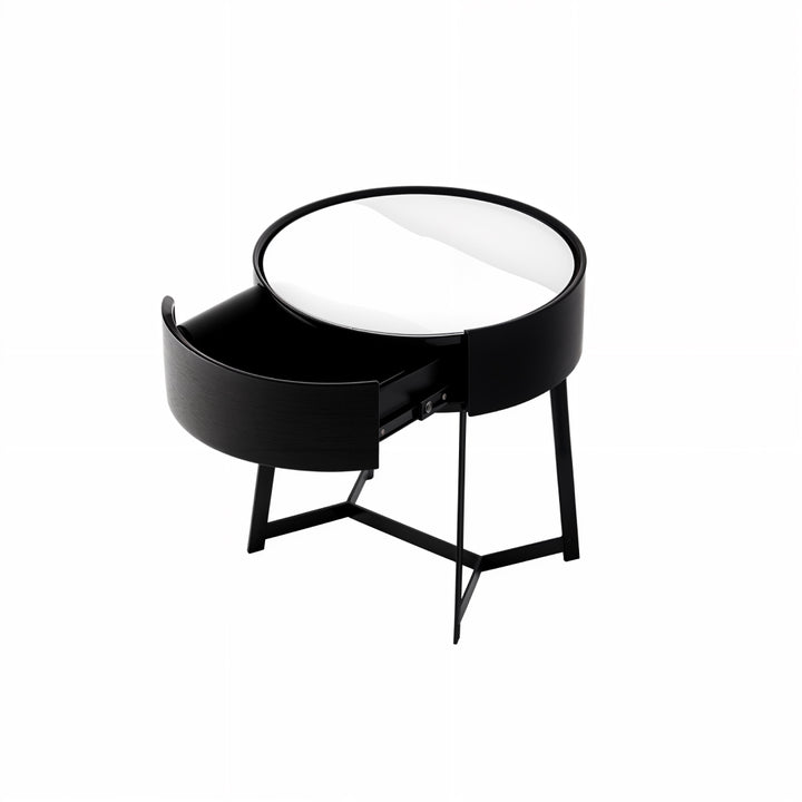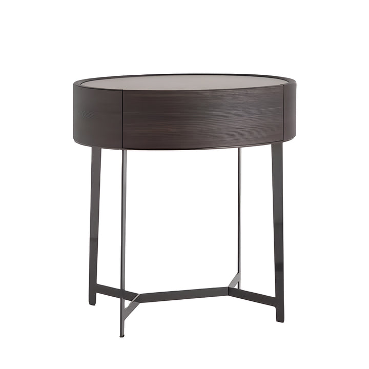 The Atero Nightstand exudes a refined balance of form and function. Featuring a sleek circular design with a deep wood veneer finish, this modern piece stands gracefully on slim metal legs. A hidden drawer offers convenient storage, seamlessly blending into the nightstand's rounded silhouette. Perfect for contemporary spaces, the Atero Nightstand is a stylish addition that brings elegance and practicality to any bedroom or living area.