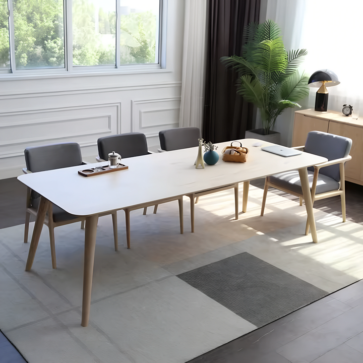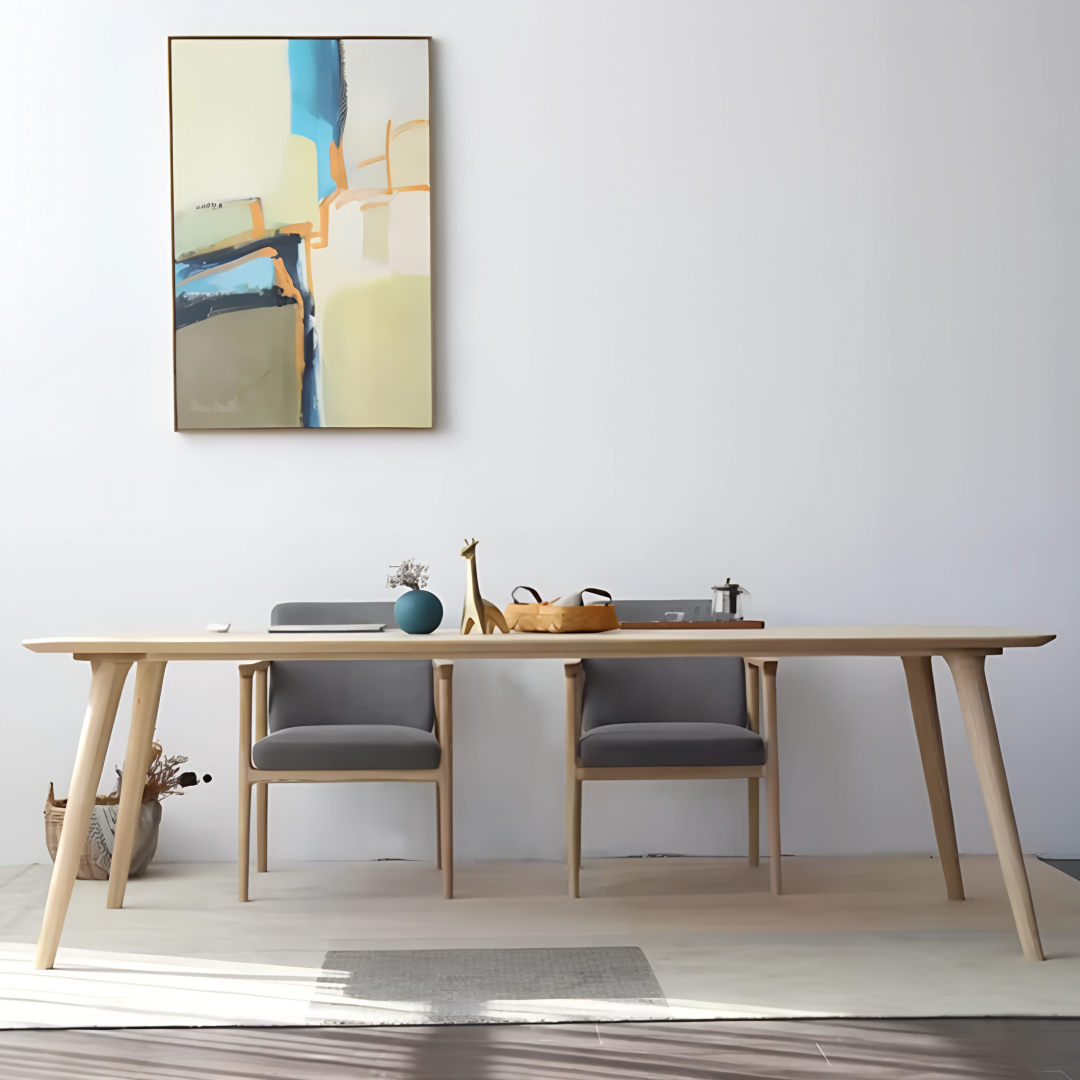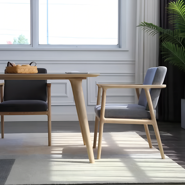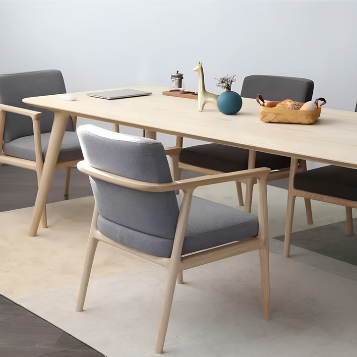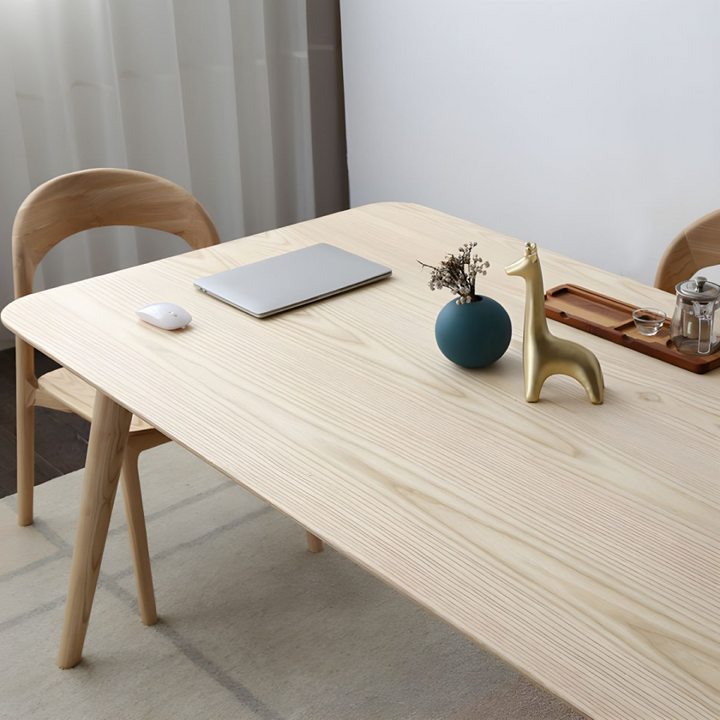 The Chiaro Dining Table offers a blend of natural beauty and clean, minimalist design. Crafted with a plywood veneer top and supported by solid wood legs, this table provides both durability and style. Its light wood tones and sleek lines make it a versatile addition to any dining space, creating an inviting atmosphere for family gatherings or casual meals.