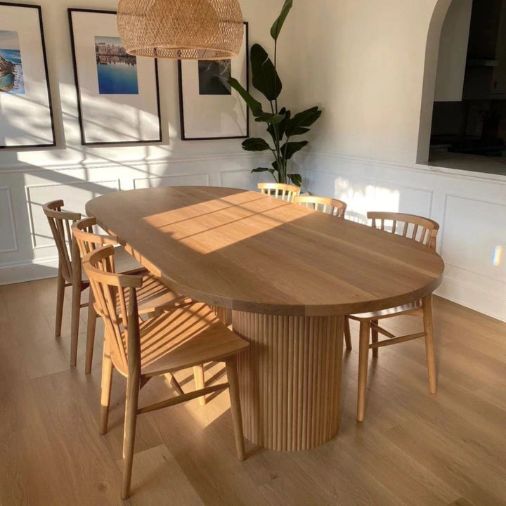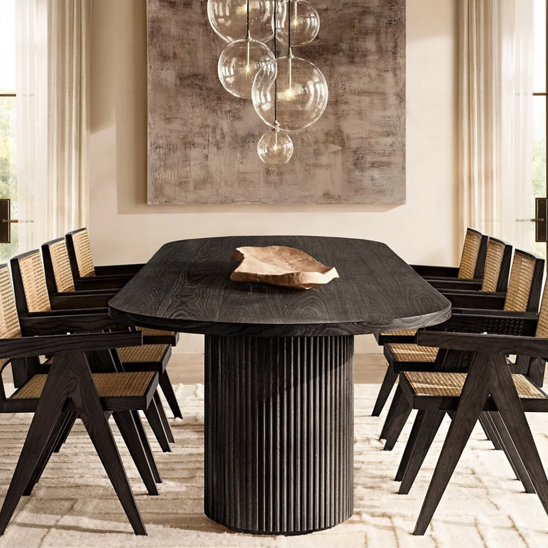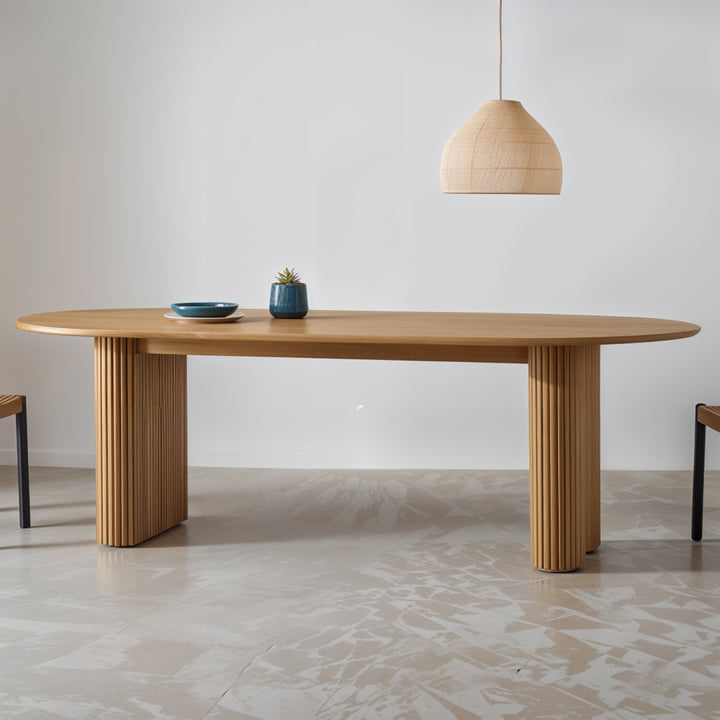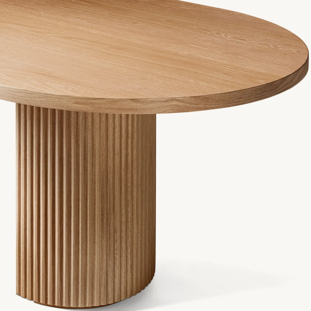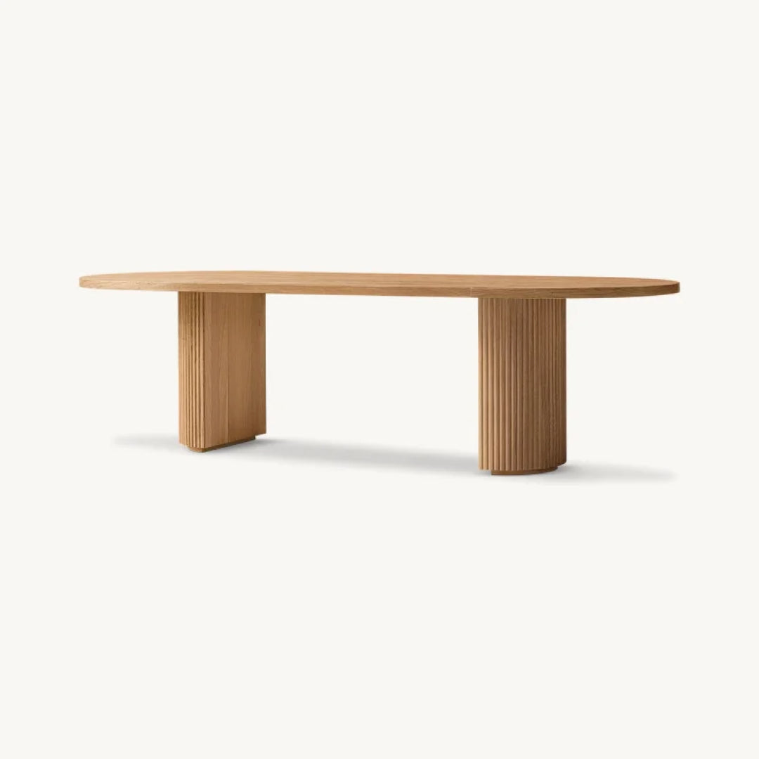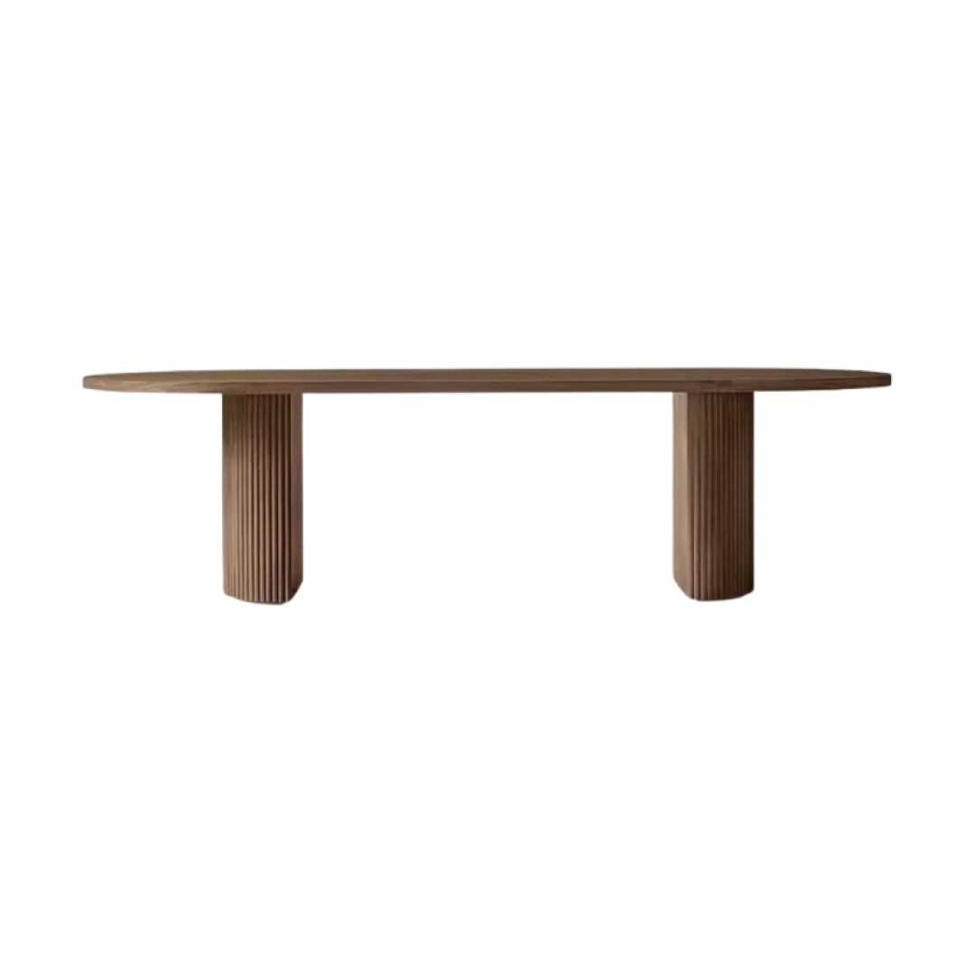 Featuring a smooth, oval top supported by two cylindrical bases, this table offers a harmonious blend of contemporary style and timeless elegance. The textured detailing on the bases creates a subtle play of light and shadow, adding depth and sophistication to any dining space. Handcrafted from kiln-dried solid hardwood, the Colonna Dining Table exudes quality and durability, designed to be the centerpiece of memorable gatherings and intimate dinners