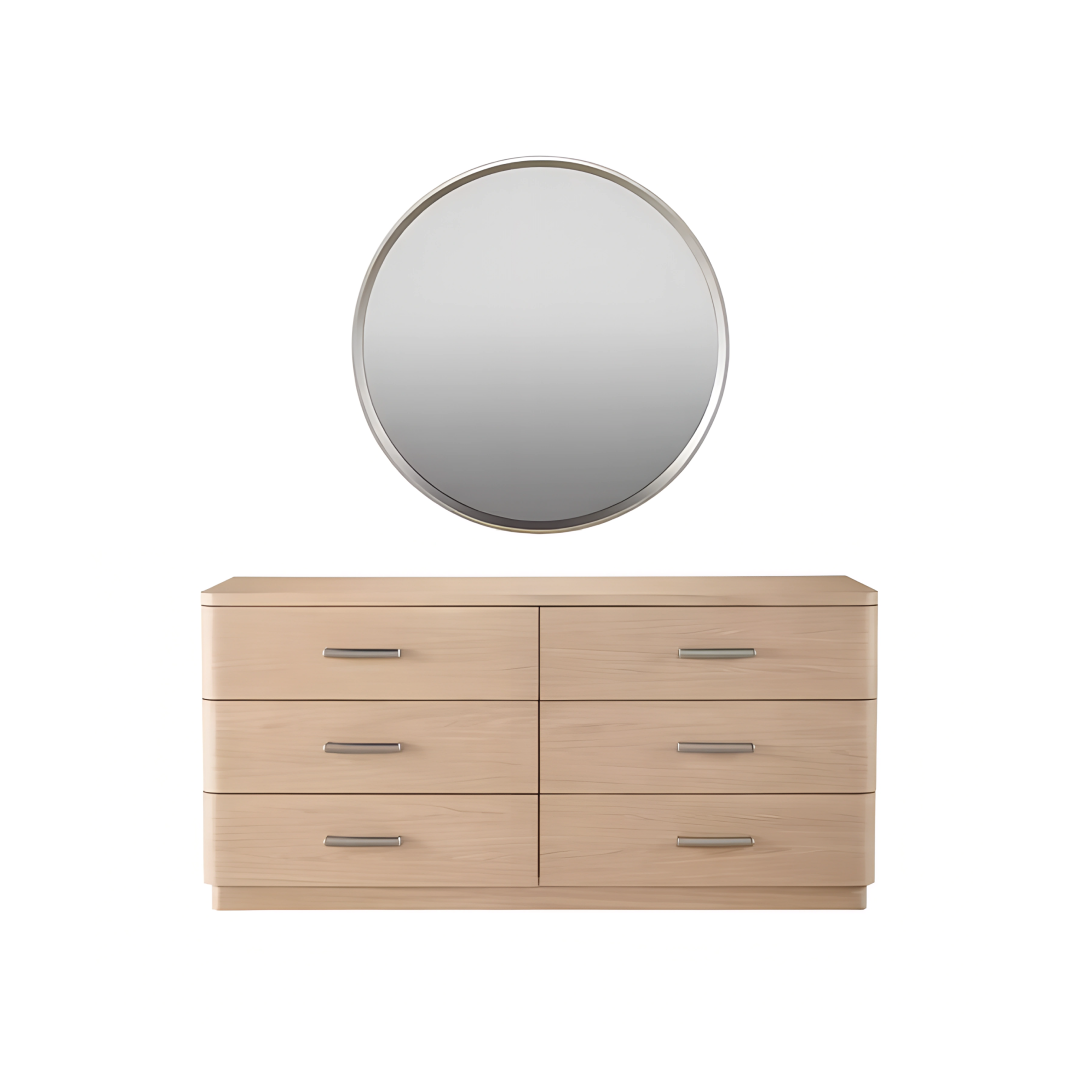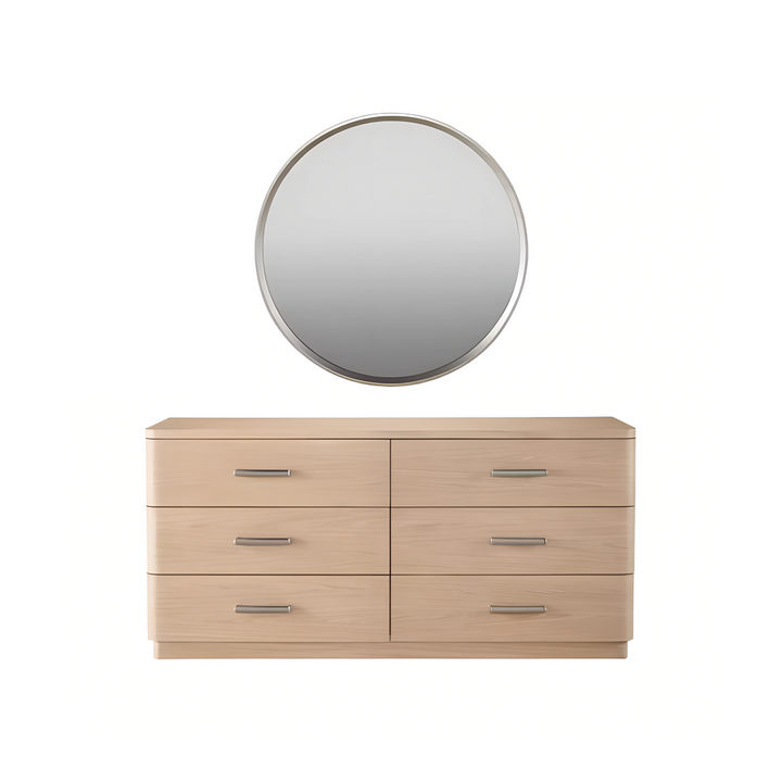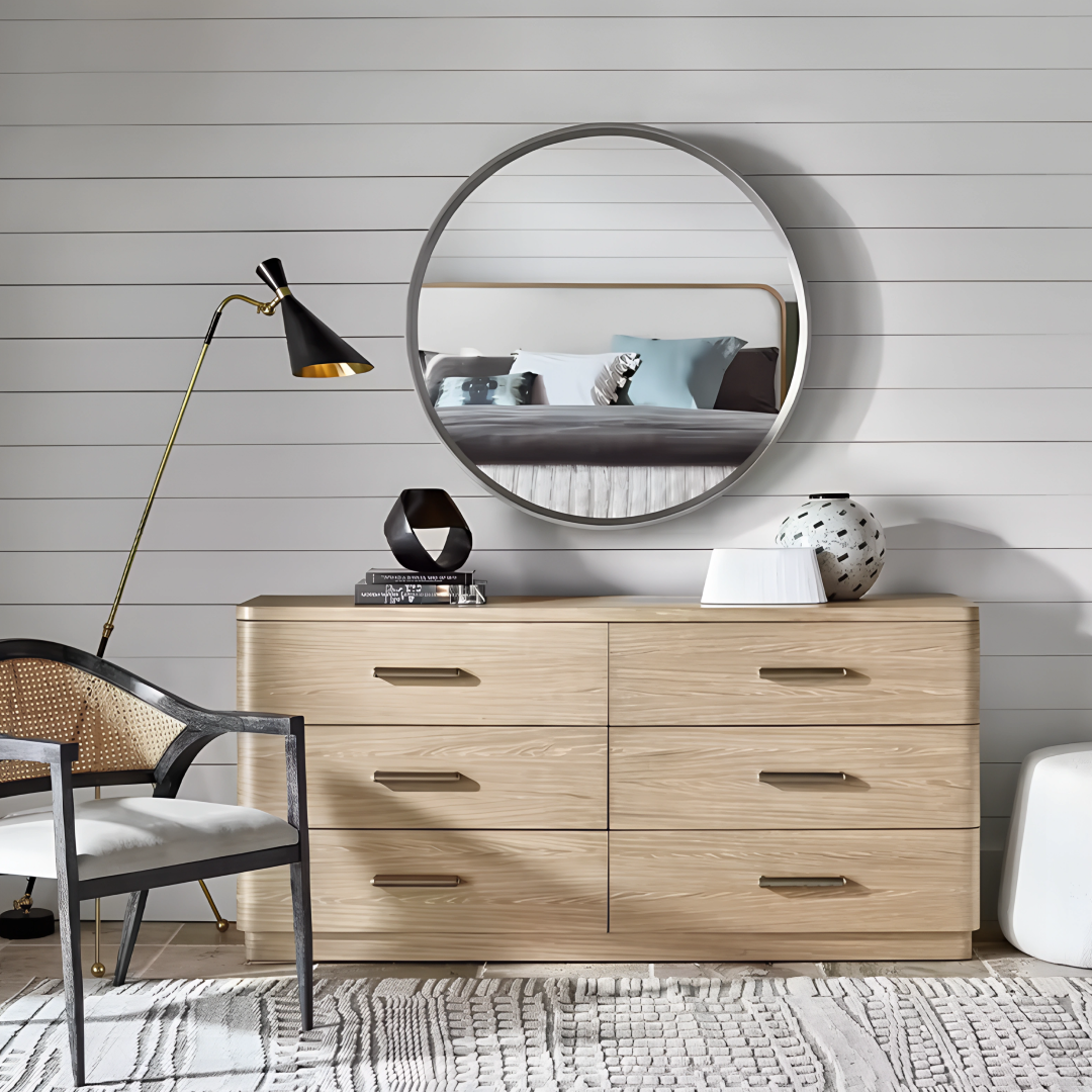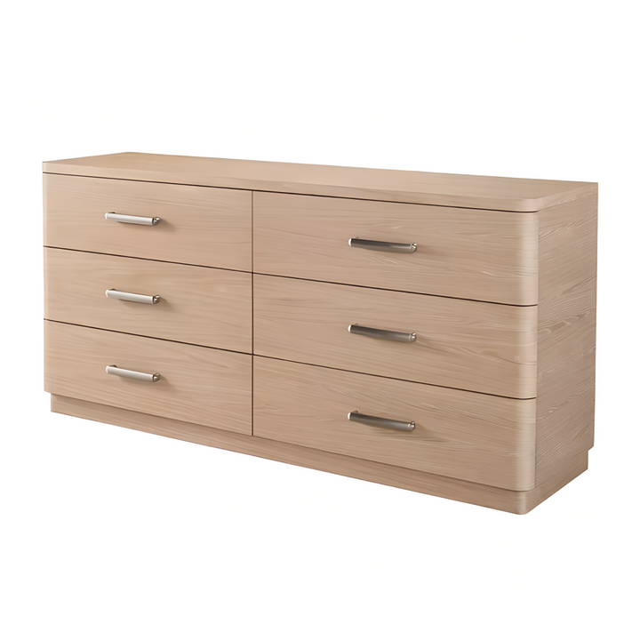 The Fresco Dresser combines clean lines with functional design, offering six roomy drawers for storage. Its rounded edges bring a subtle softness to the structure, while the natural veneer finish enhances its modern appeal. This dresser is perfect for adding a touch of elegance and practicality to any bedroom.