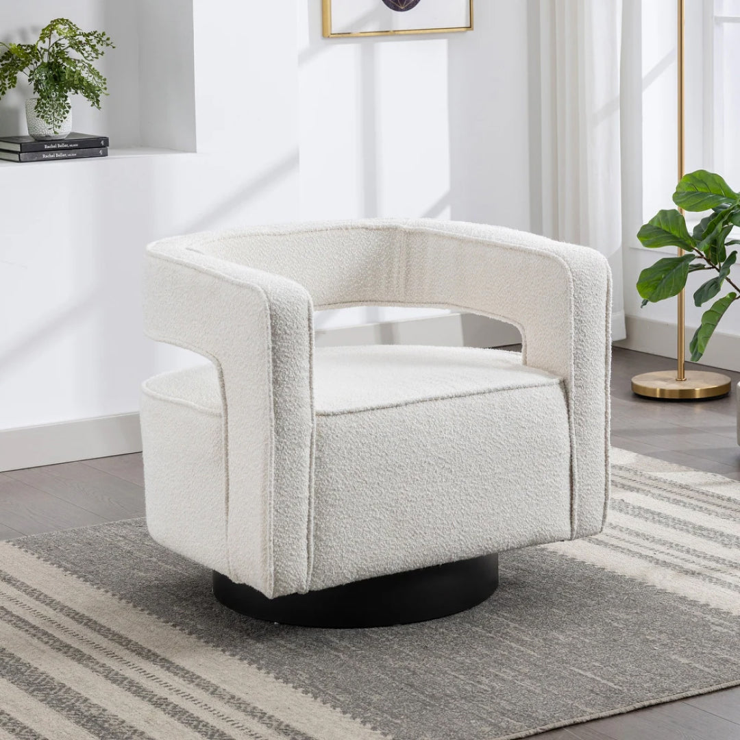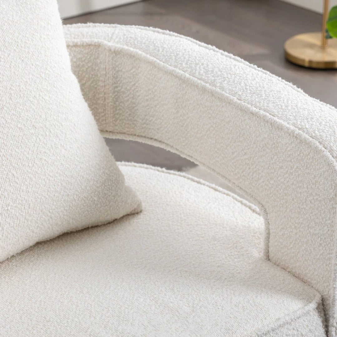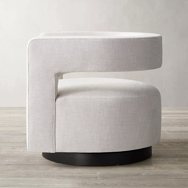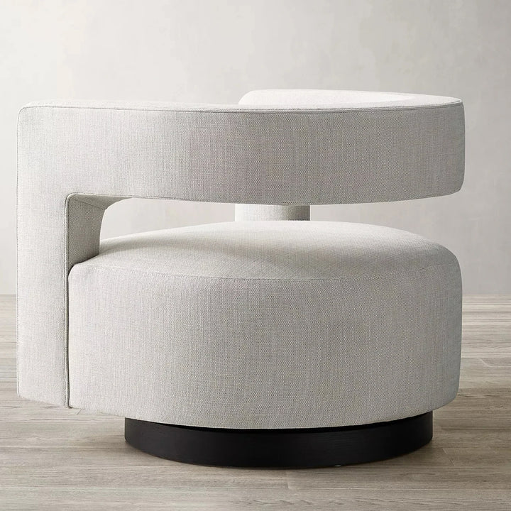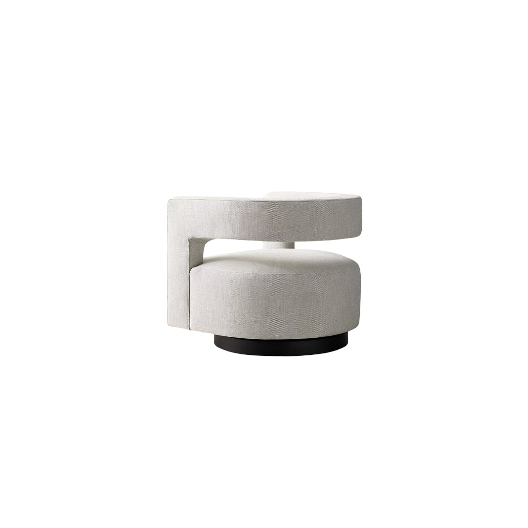 Giove swivel armchair balances bold design and comfort. Its curved backrest embraces you in a plush seat supported by a handcrafted, kiln-dried solid wood frame with reinforced joinery. The minimal fabric finish highlights its refined elegance, while the spring suspension and woven webbing provide lasting comfort. Perfect as an accent chair or for relaxing in style, Giove offers versatility with a touch of sculptural appeal.