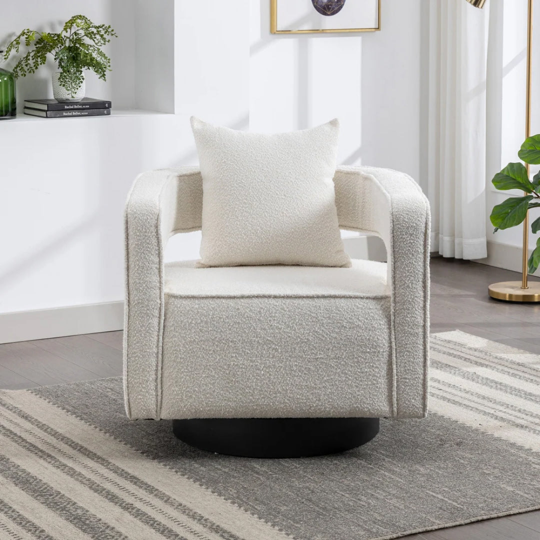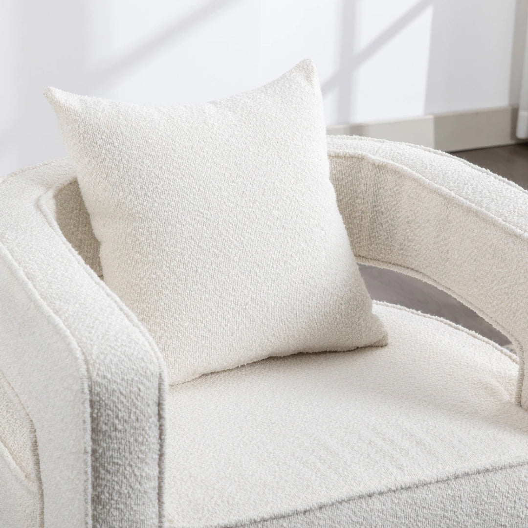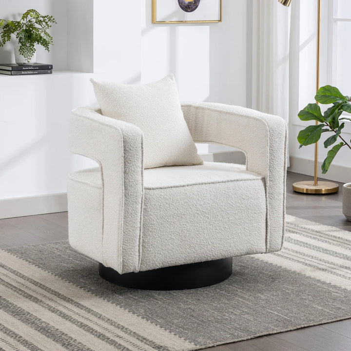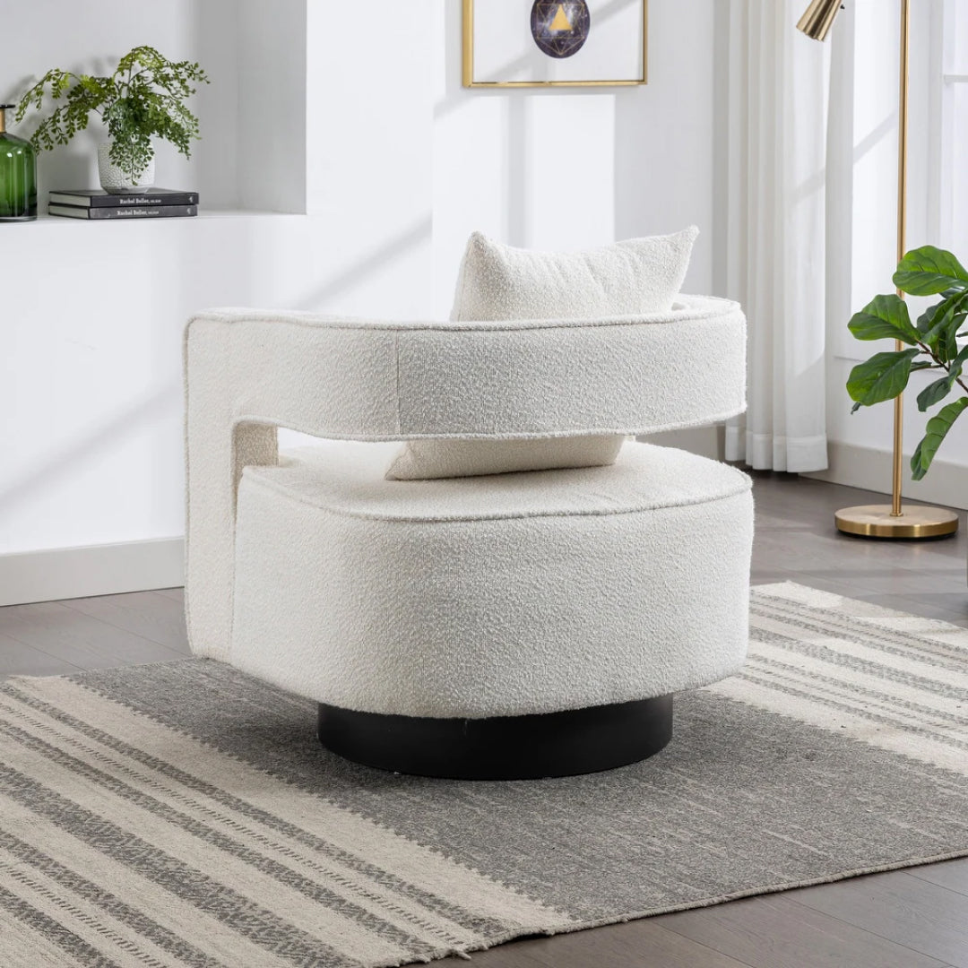 Giove swivel armchair balances bold design and comfort. Its curved backrest embraces you in a plush seat supported by a handcrafted, kiln-dried solid wood frame with reinforced joinery. The minimal fabric finish highlights its refined elegance, while the spring suspension and woven webbing provide lasting comfort. Perfect as an accent chair or for relaxing in style, Giove offers versatility with a touch of sculptural appeal.