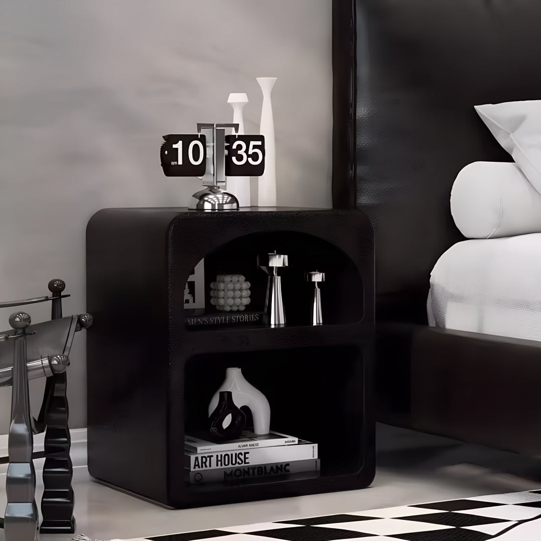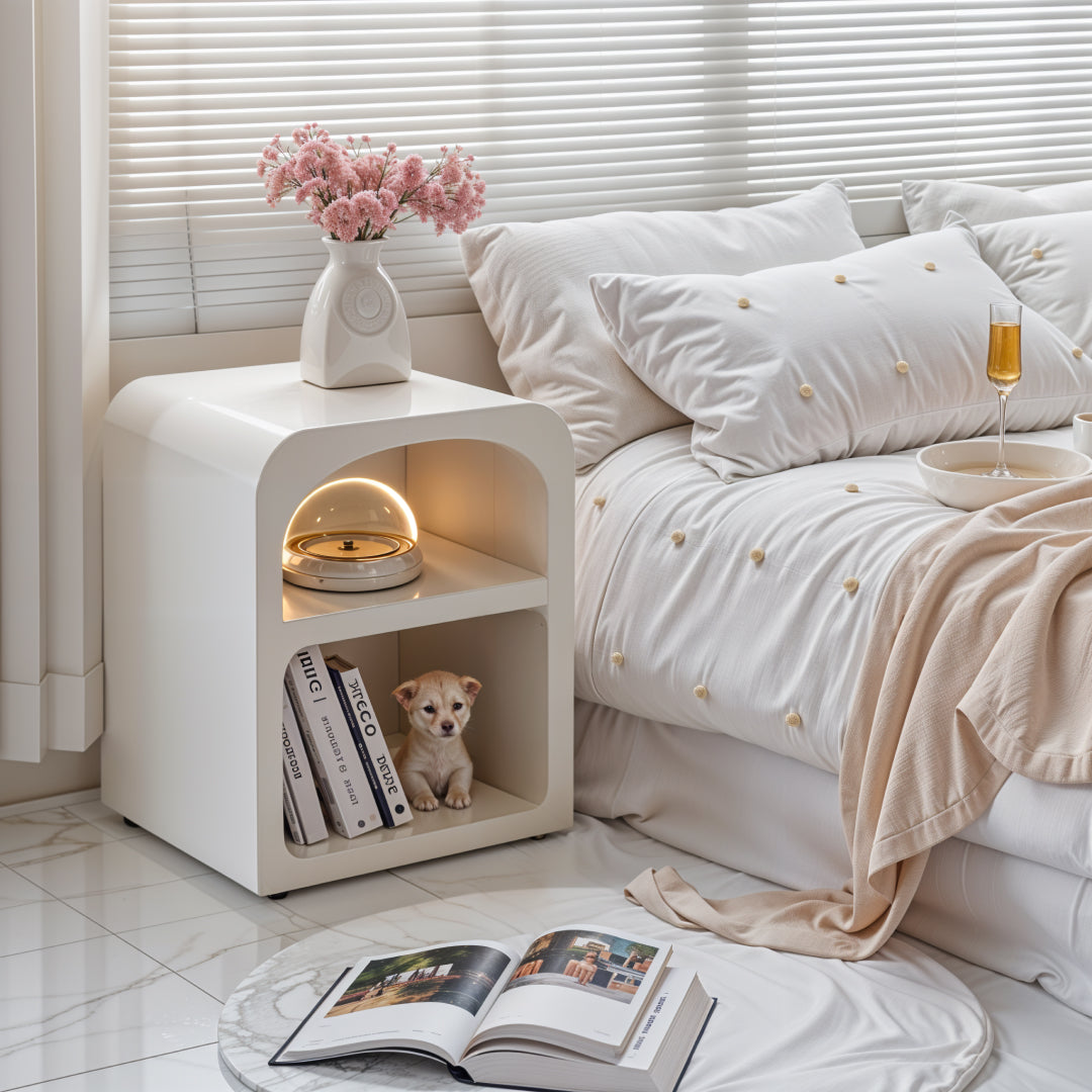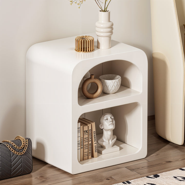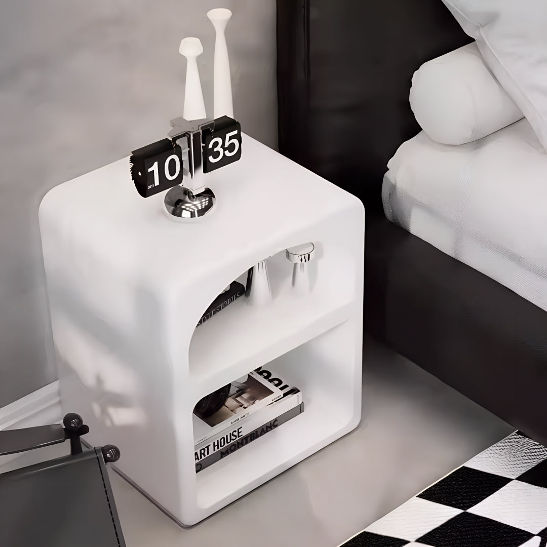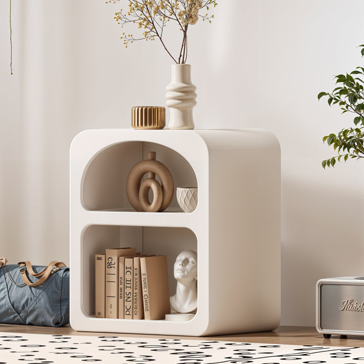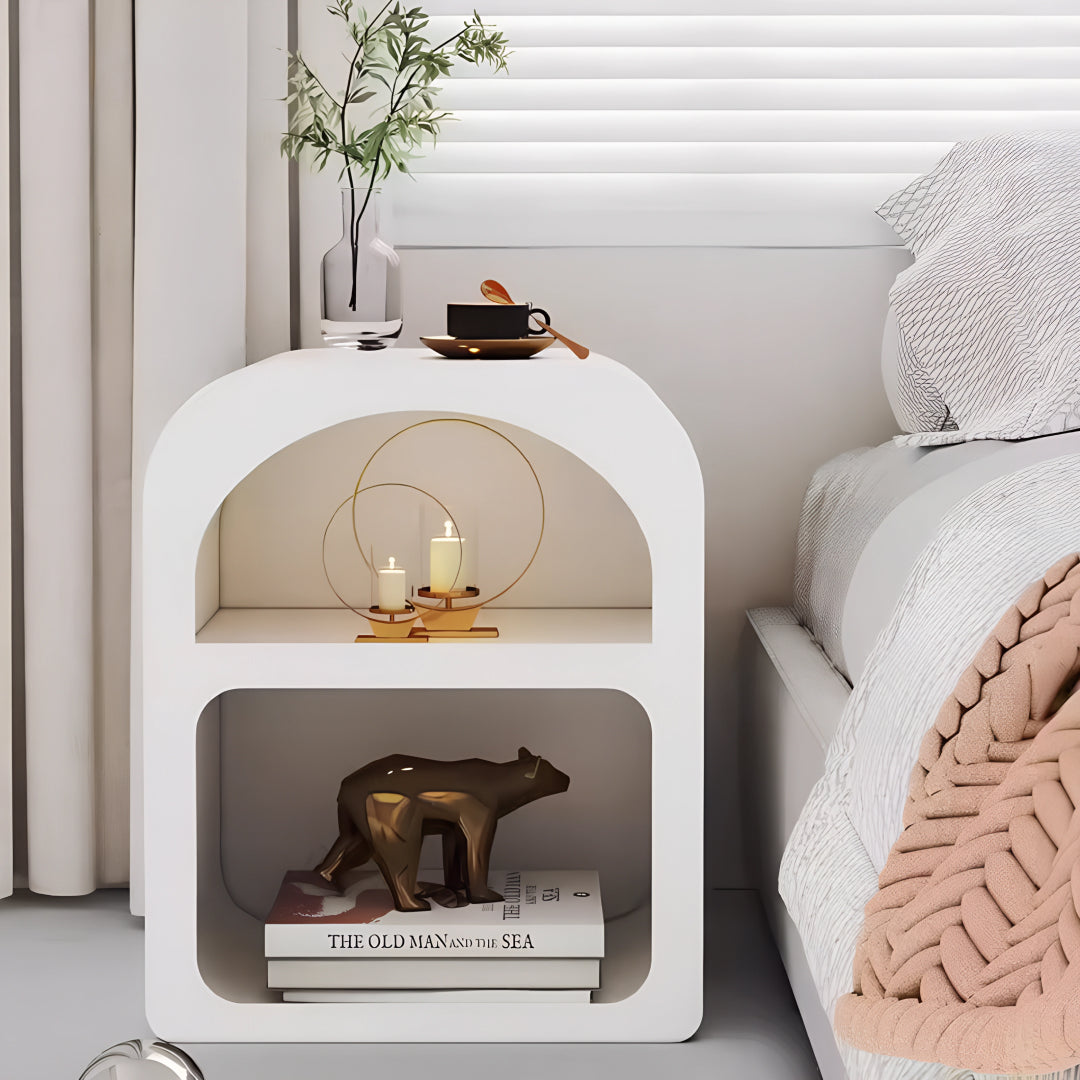 The Lago Nightstand is a perfect blend of contemporary design and practicality. Featuring two open shelves, it offers ample space for bedside essentials or decorative items. Made from durable MDF and finished in a smooth white coating, the soft rounded edges and arch details create a harmonious and modern aesthetic. This nightstand adds a serene touch to your bedroom while providing convenient storage