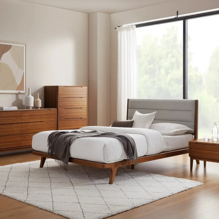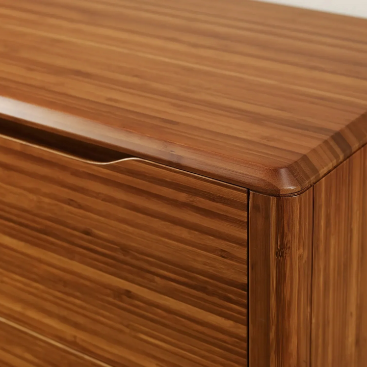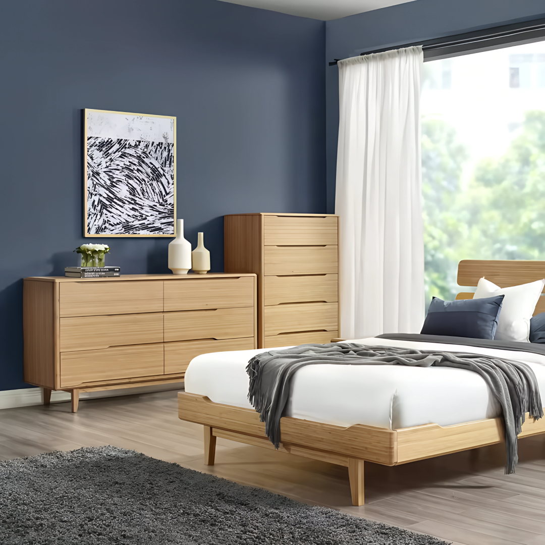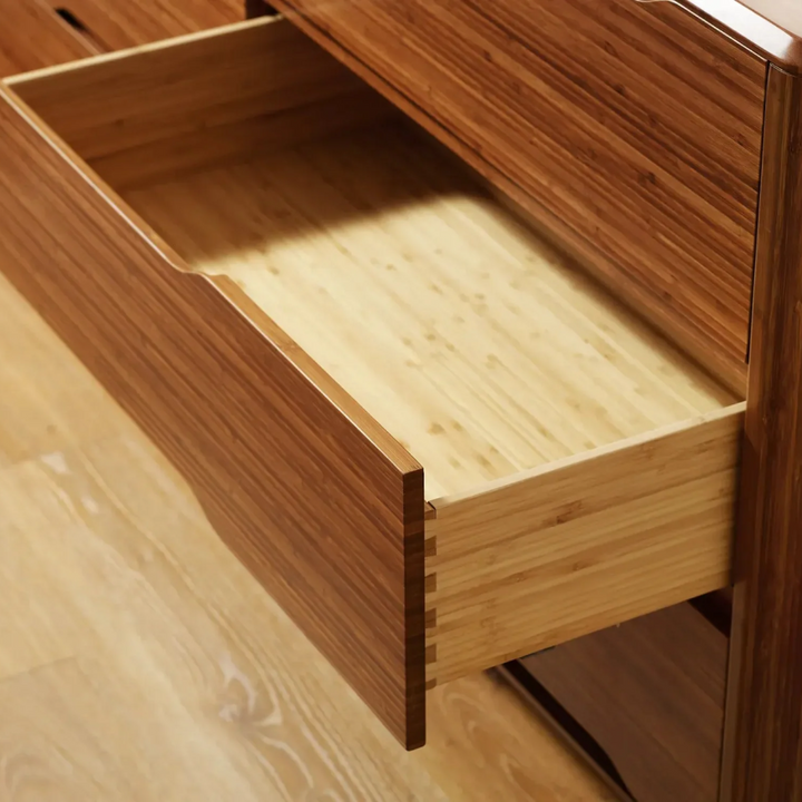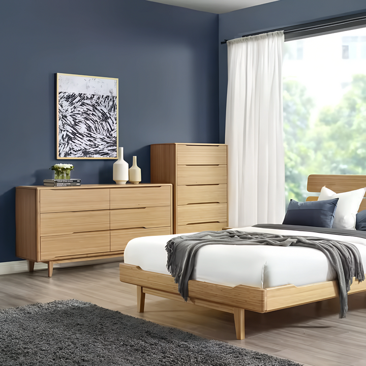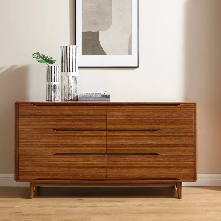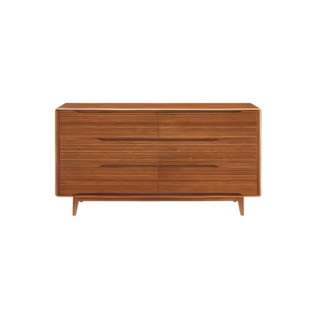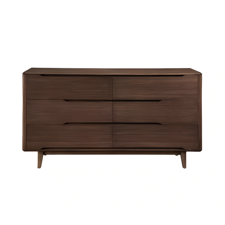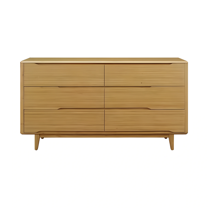 The Lignano Dresser features six drawers designed for ample storage, blending mid-century modern aesthetics with contemporary functionality. Its smooth, natural plywood finish is elevated by solid wood legs, giving it a timeless look that adds warmth to any space. Perfect for bedrooms or living spaces seeking a refined, clean-lined storage solution.