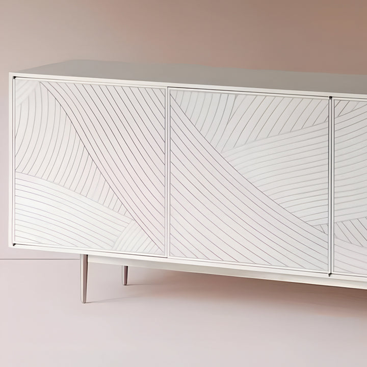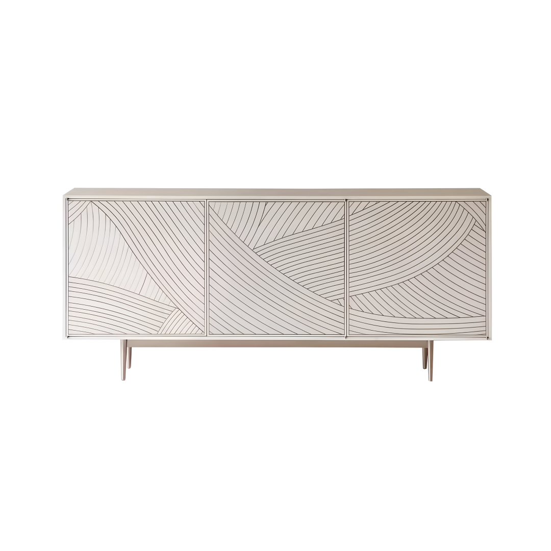 Made of plywood with a distinctive geometric design on the facade, the Linea Sideboard is a noteworthy example of modern craftsmanship. Sleek stainless steel base offers a strong foundation and modern flare, while flowing lines evoke movement and artistry. In addition to being aesthetically pleasing, this sideboard is useful as well as providing plenty of storage space behind its chic doors. This elegance will easily enhance the décor of your living room, dining room, or entryways.