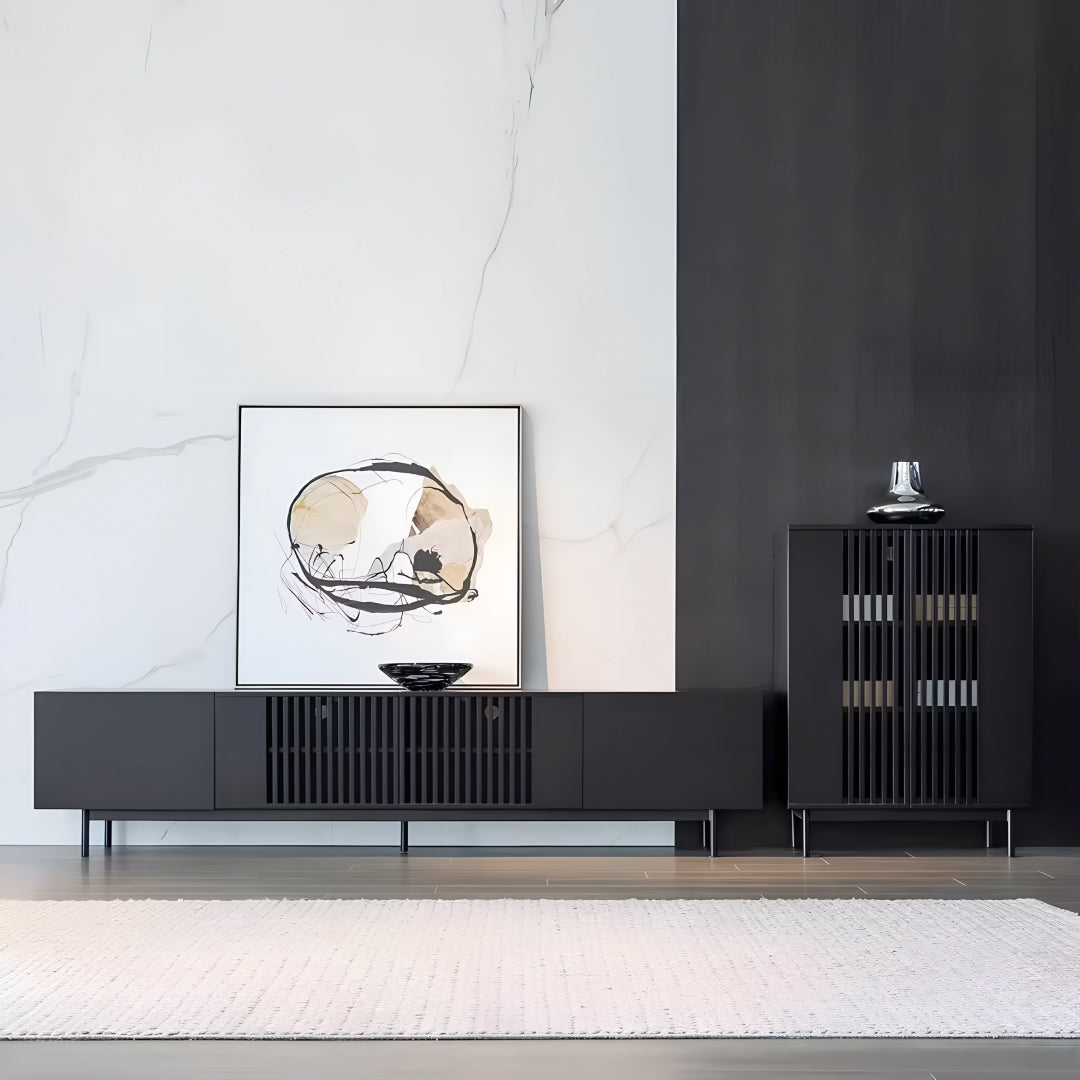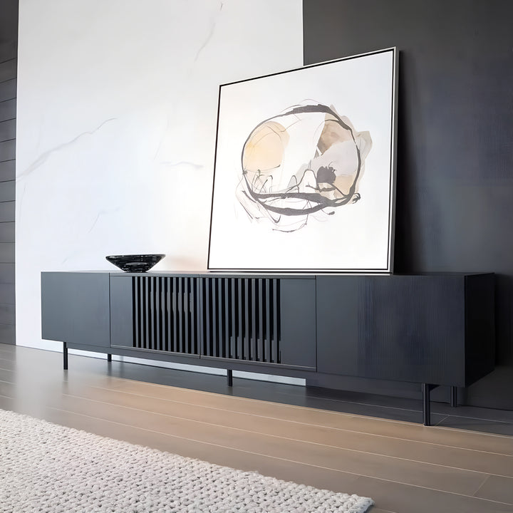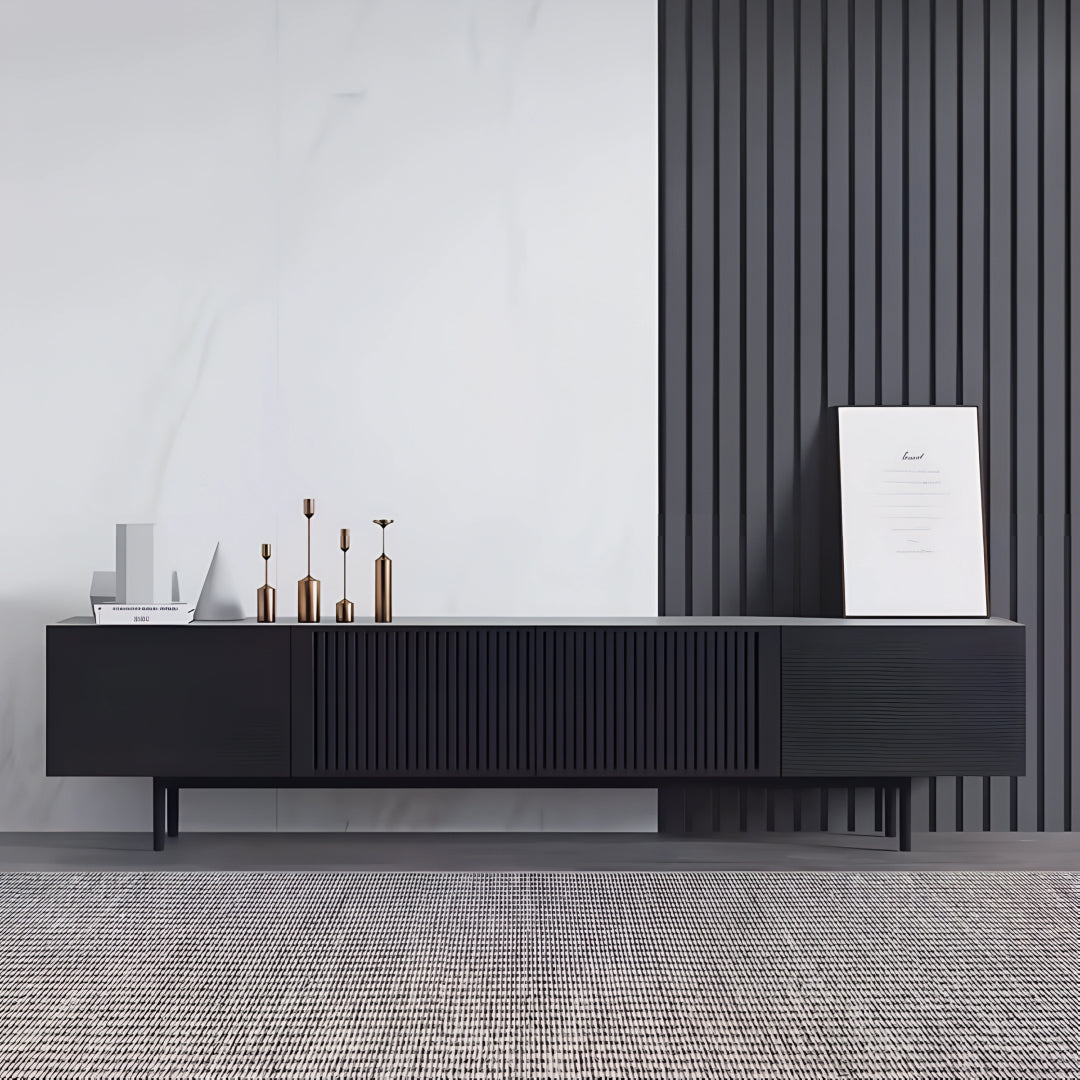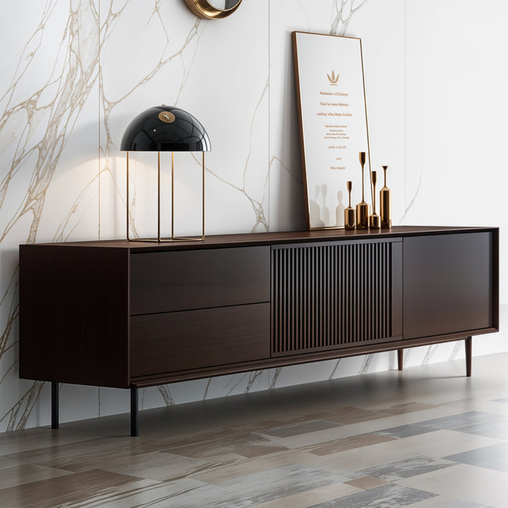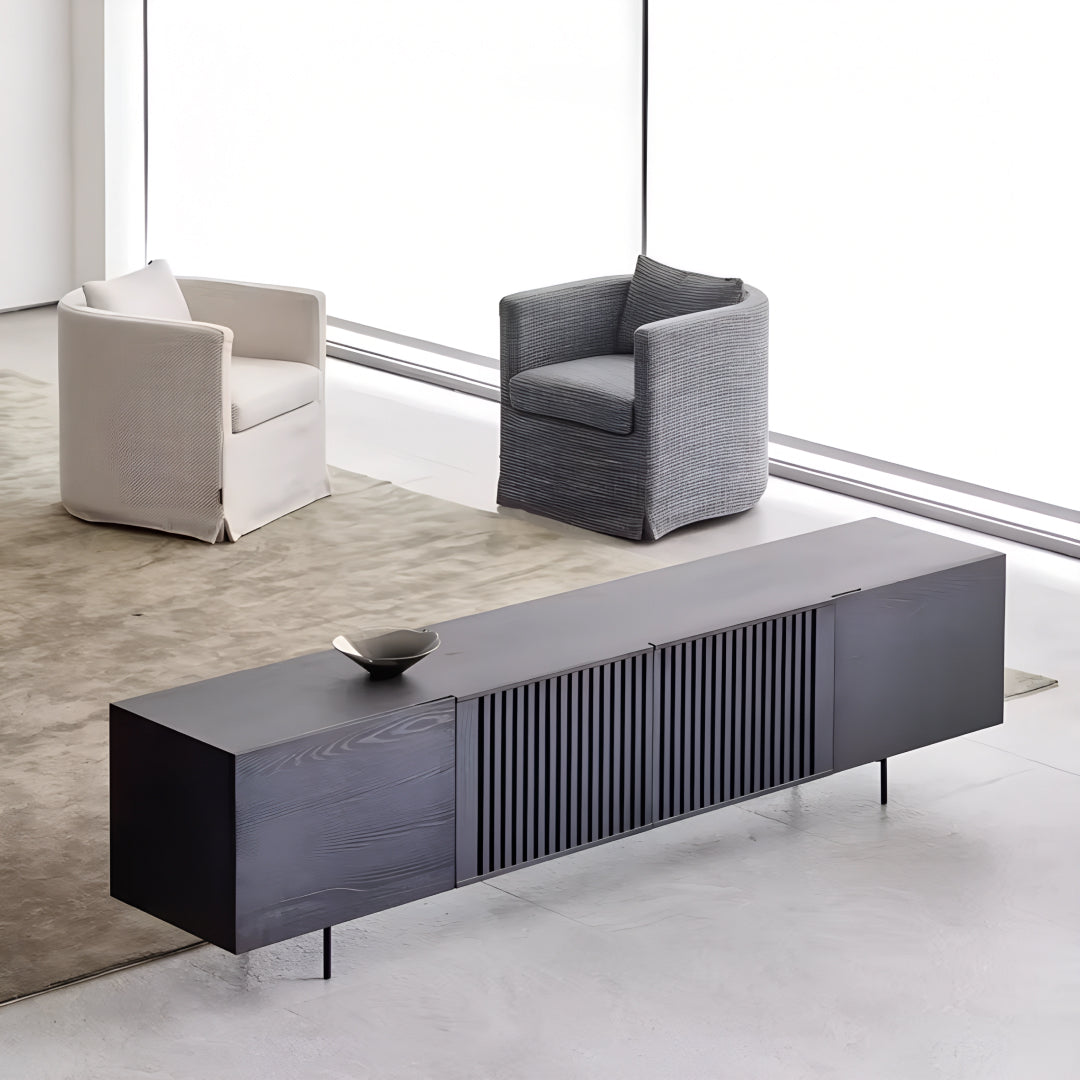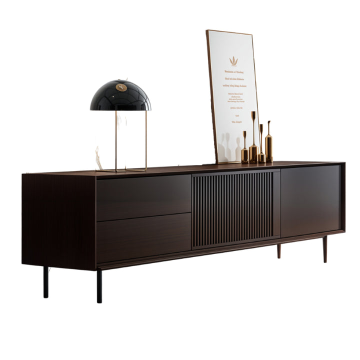 This TV-cabinet presents a seamless fusion of elegance and practicality, crafted from plywood with solid wood drawers. Its minimalist silhouette enhances modern interiors, while the vertical paneling on the front adds a touch of character. Supported by sleek metal legs, this console exudes a sense of refined sophistication, perfect for contemporary living spaces.