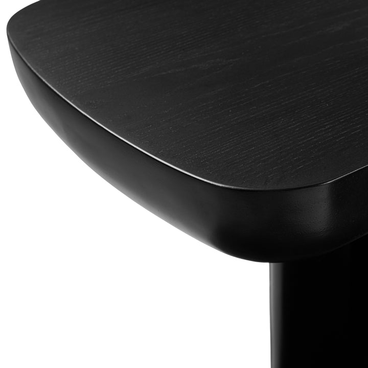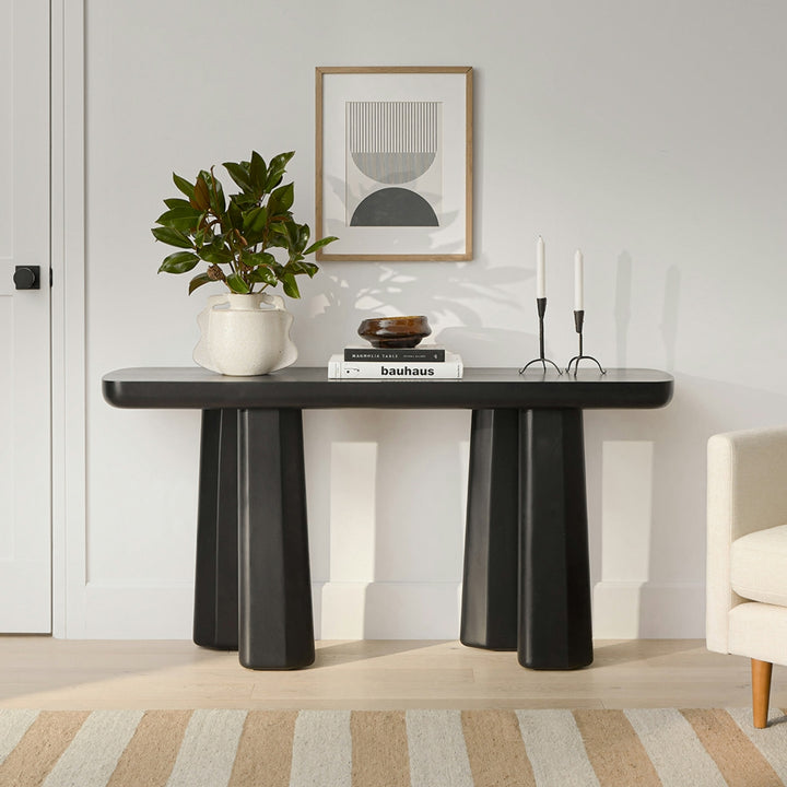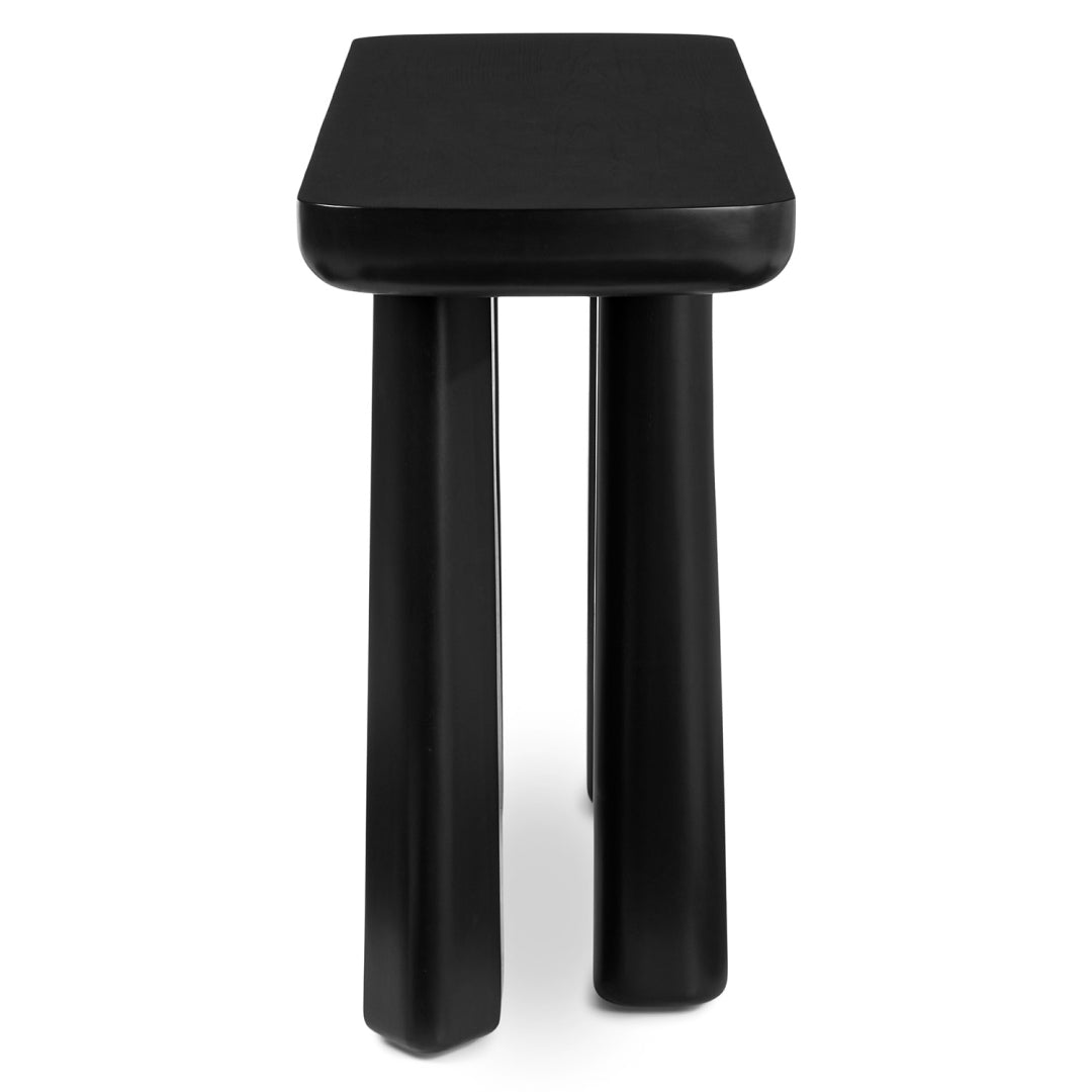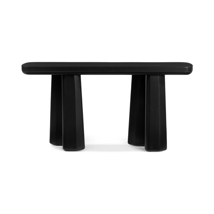The Nero Console Table exudes modern sophistication with its bold, sculptural design. Crafted entirely from solid wood, this table stands out with its sturdy, geometric legs and sleek black finish. Its minimalist form brings a sense of strength and refined elegance, making it a perfect statement piece for entryways, living rooms, or dining spaces. This table is both functional and visually striking, ideal for interiors that embrace contemporary style.
