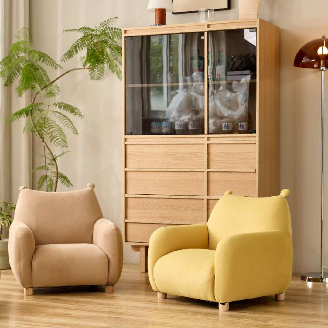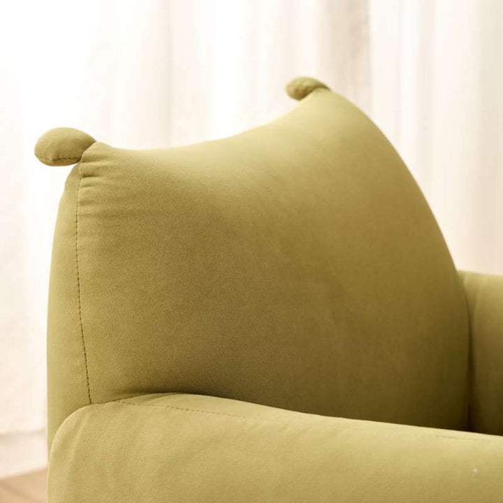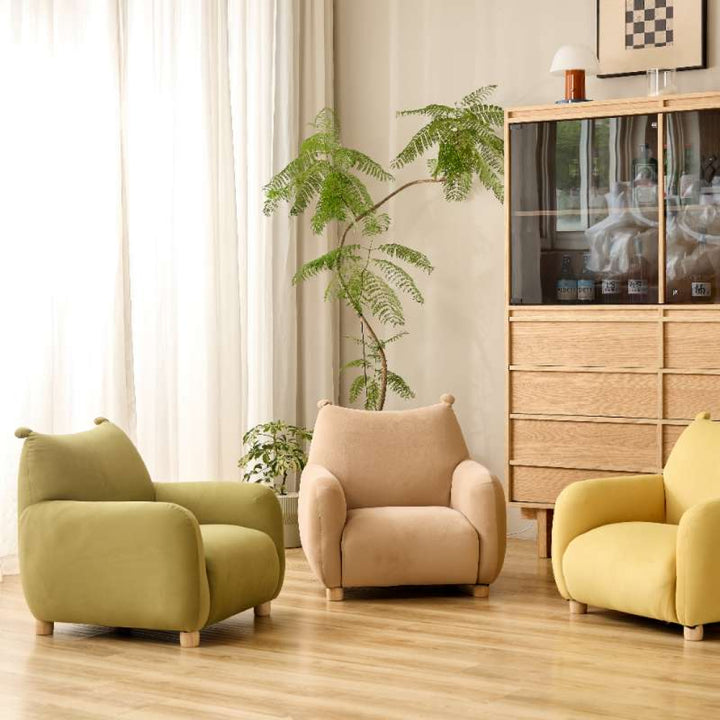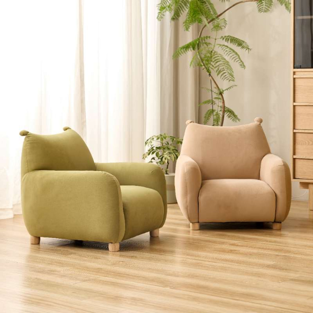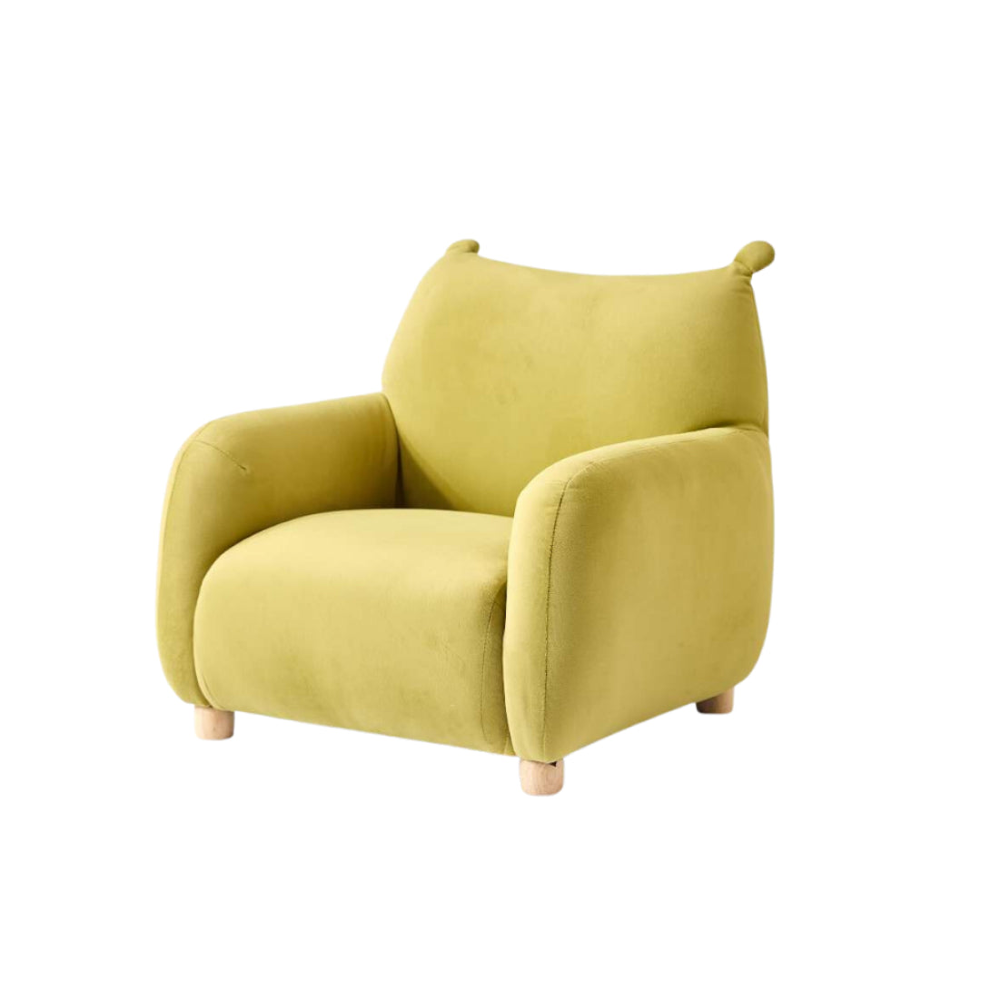 With its soft, velvety padding and elegant contours, it offers a snug, comfy seat that's ideal for lounging, playing, or reading. Without overpowering the minimalist style, its whimsical charm is subtly enhanced by its fun, ear-like details on the backrest. The Oliva Chair is a charming addition that blends style and comfort, ideal for fostering creativity in any space. It is constructed with robust hardwood legs for endurance.