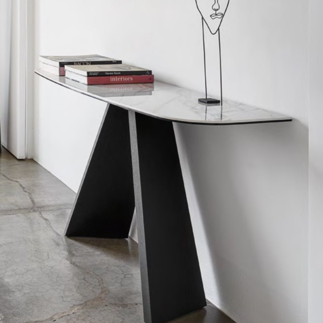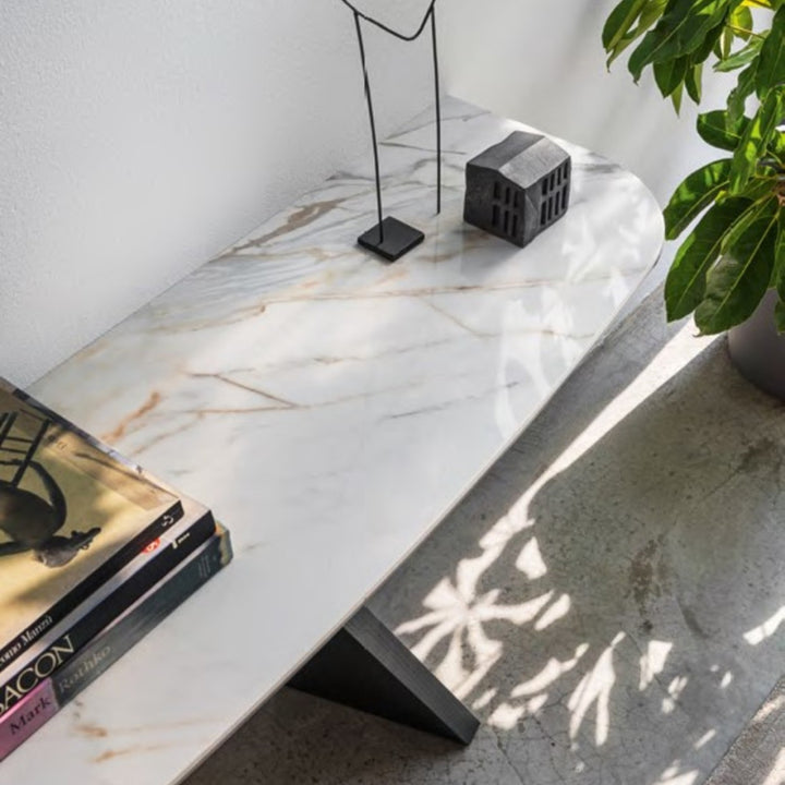 The Ottimo Coffee Table is a striking piece that combines the luxurious elegance of a Carrara marble top with the bold industrial appeal of stainless steel legs. The distinct leg design gives it a modern sculptural look, perfect for adding a touch of sophistication to any entryway or hallway