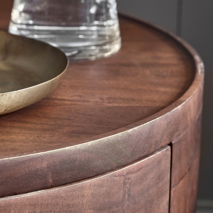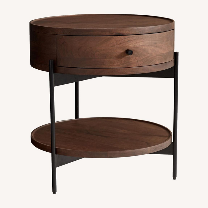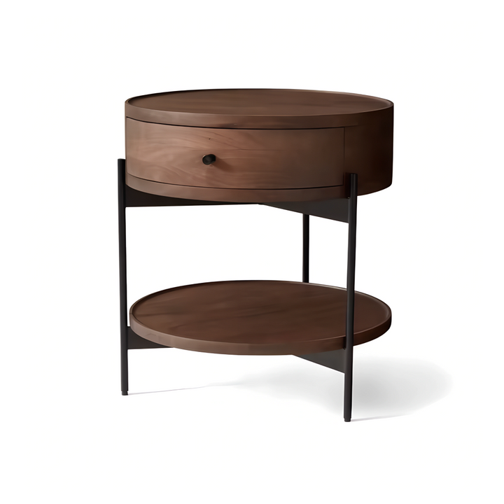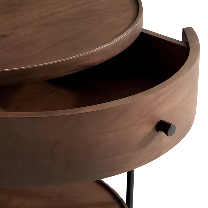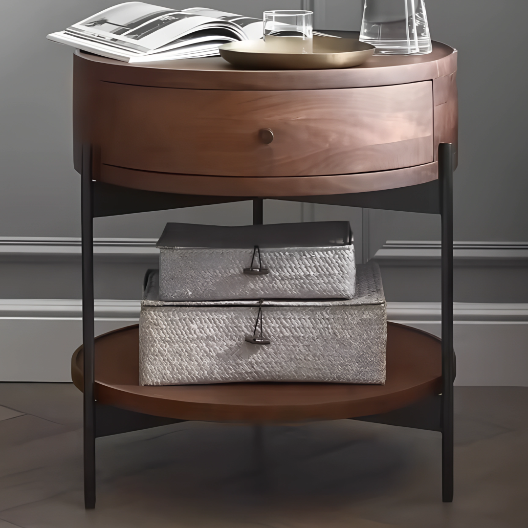 The Rotondo Nightstand combines a unique round design with functionality, featuring a single drawer and a spacious lower shelf for storage. Its warm wood finish and contrasting metal legs create a modern yet timeless look, making it an eye-catching addition to any bedroom. The circular design brings a touch of elegance while offering practical storage solutions