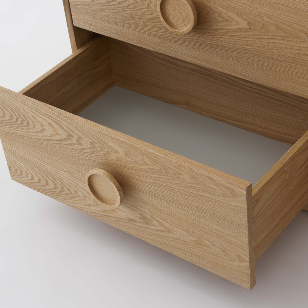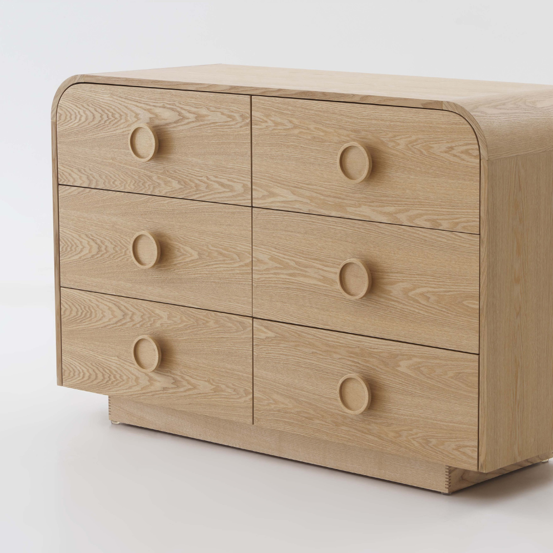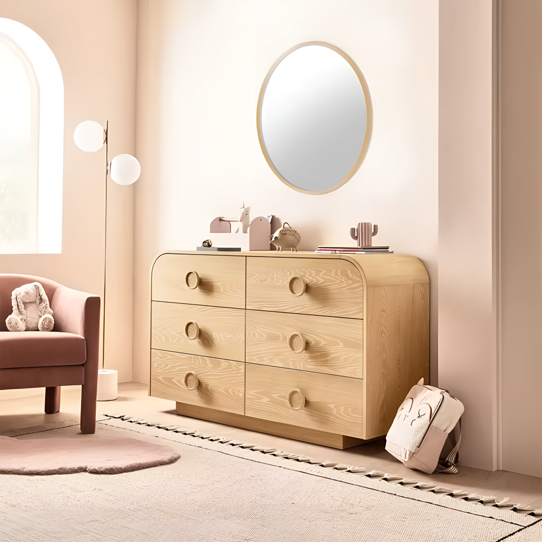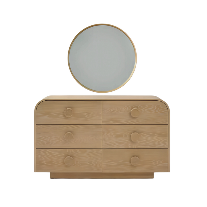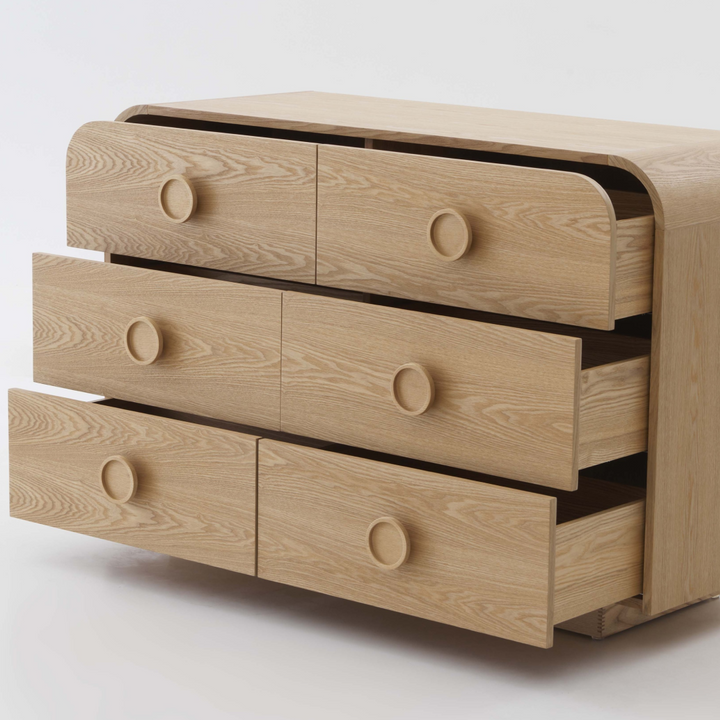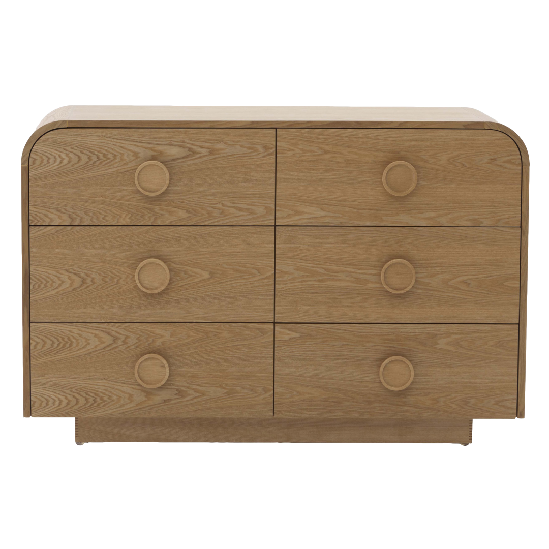 The Solaro Dresser features a soft, rounded design that adds a touch of warmth and elegance to any bedroom. With six spacious drawers, it offers ample storage for your essentials while maintaining a clean, minimal look. The natural wood finish highlights its craftsmanship, making it a timeless piece that enhances any interior style