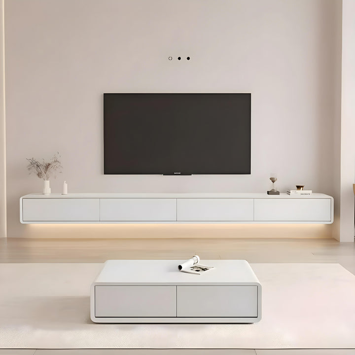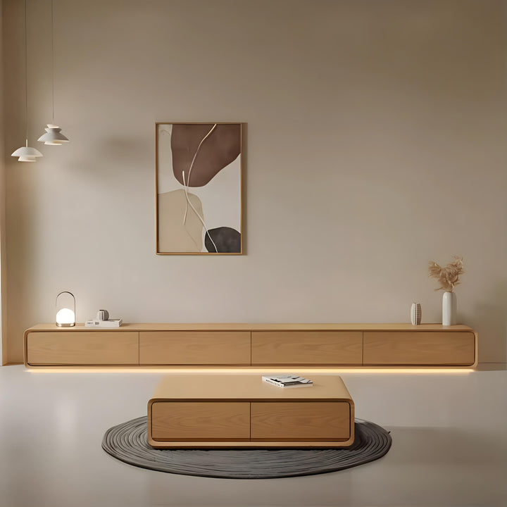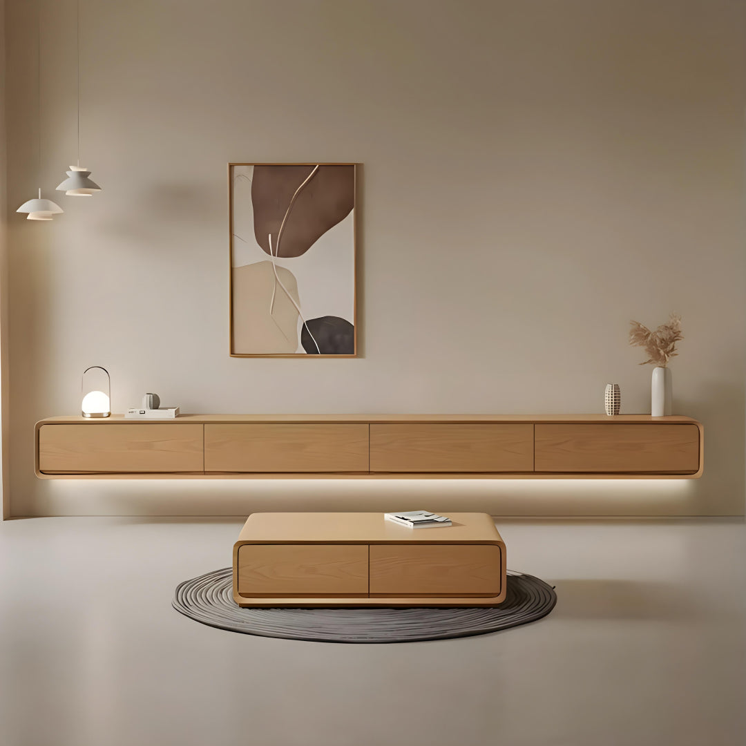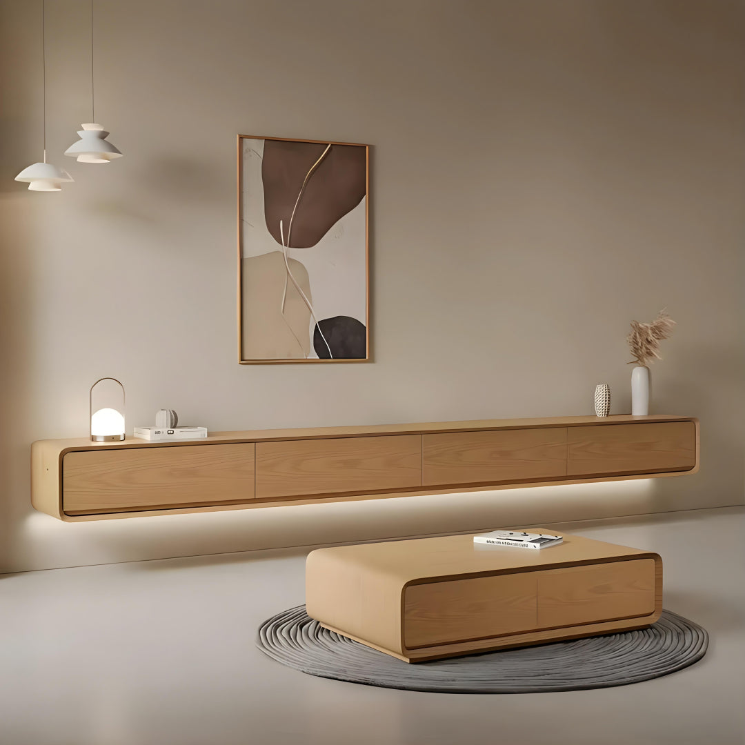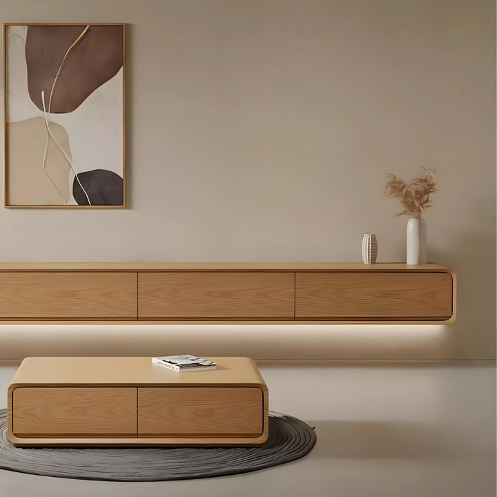 The Soleto Wall TV-cabnet brings a minimalist charm with its natural wood tones, designed to elevate your living space with understated sophistication. Crafted with a durable plywood frame and smooth solid wood drawers, this floating console offers both form and function, perfect for organizing your essentials while maintaining a clean, modern aesthetic. The seamless design is enhanced by a soft, ambient LED underglow, making it an eye-catching focal point for any contemporary interior.