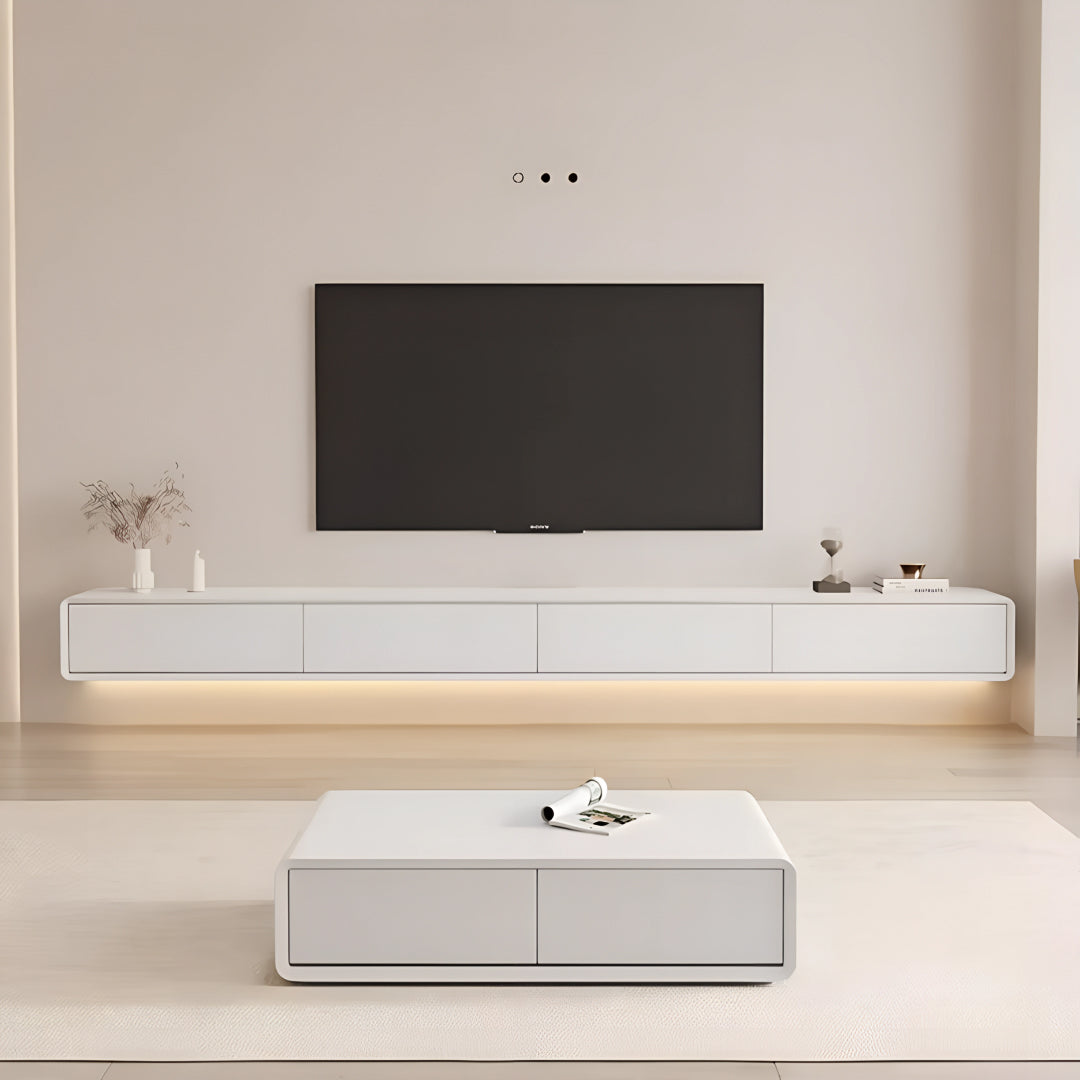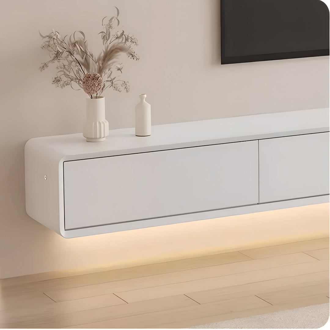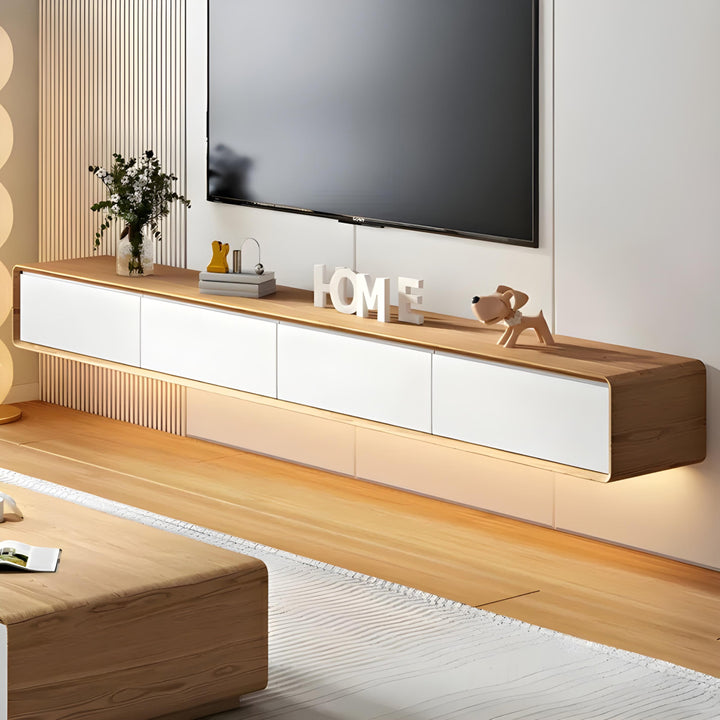 The Soleto Wall TV-cabinet brings a minimalist charm with its natural wood tones, designed to elevate your living space with understated sophistication. Crafted with a durable plywood frame and smooth solid wood drawers, this floating console offers both form and function, perfect for organizing your essentials while maintaining a clean, modern aesthetic. The seamless design is enhanced by a soft, ambient LED underglow, making it an eye-catching focal point for any contemporary interior.