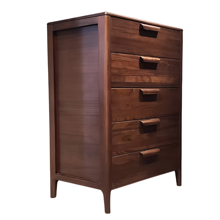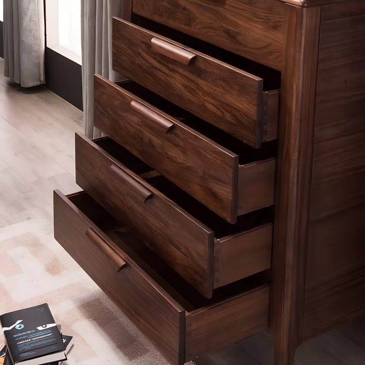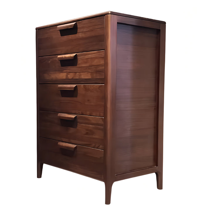 The Tallora Chest brings refined elegance to your storage needs. Handcrafted from kiln-dried wood with 45S oak solid wood veneers, it features five spacious drawers with soft-close functionality. The tall, slender design allows for ample storage without taking up too much space, while the clean lines and rounded edges enhance its contemporary aesthetic. Solid wood legs add stability, making Tallora a perfect addition to modern bedrooms or living spaces
