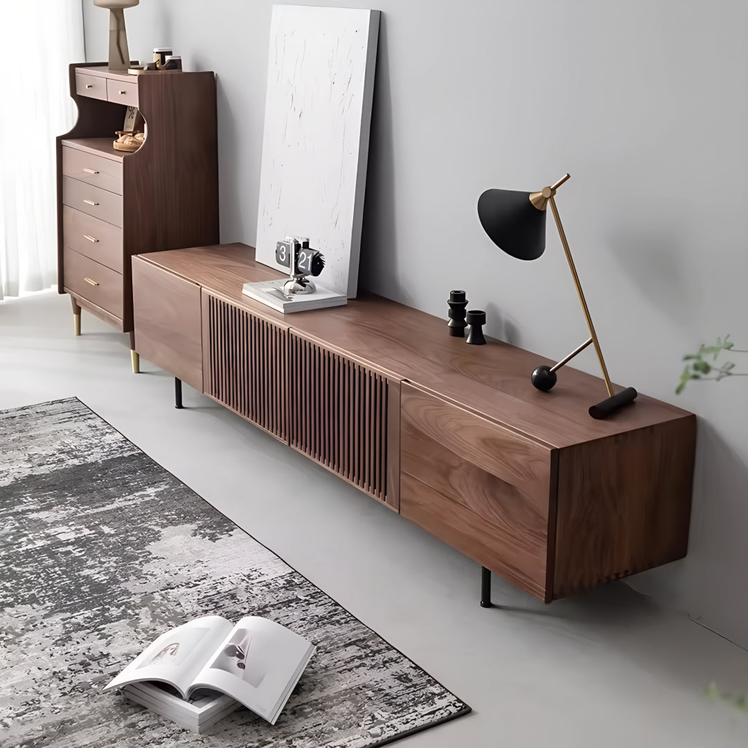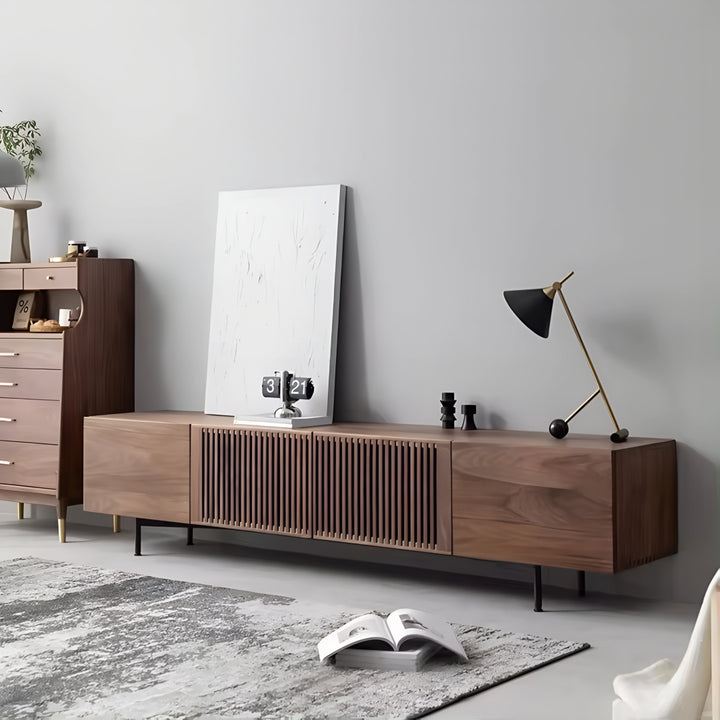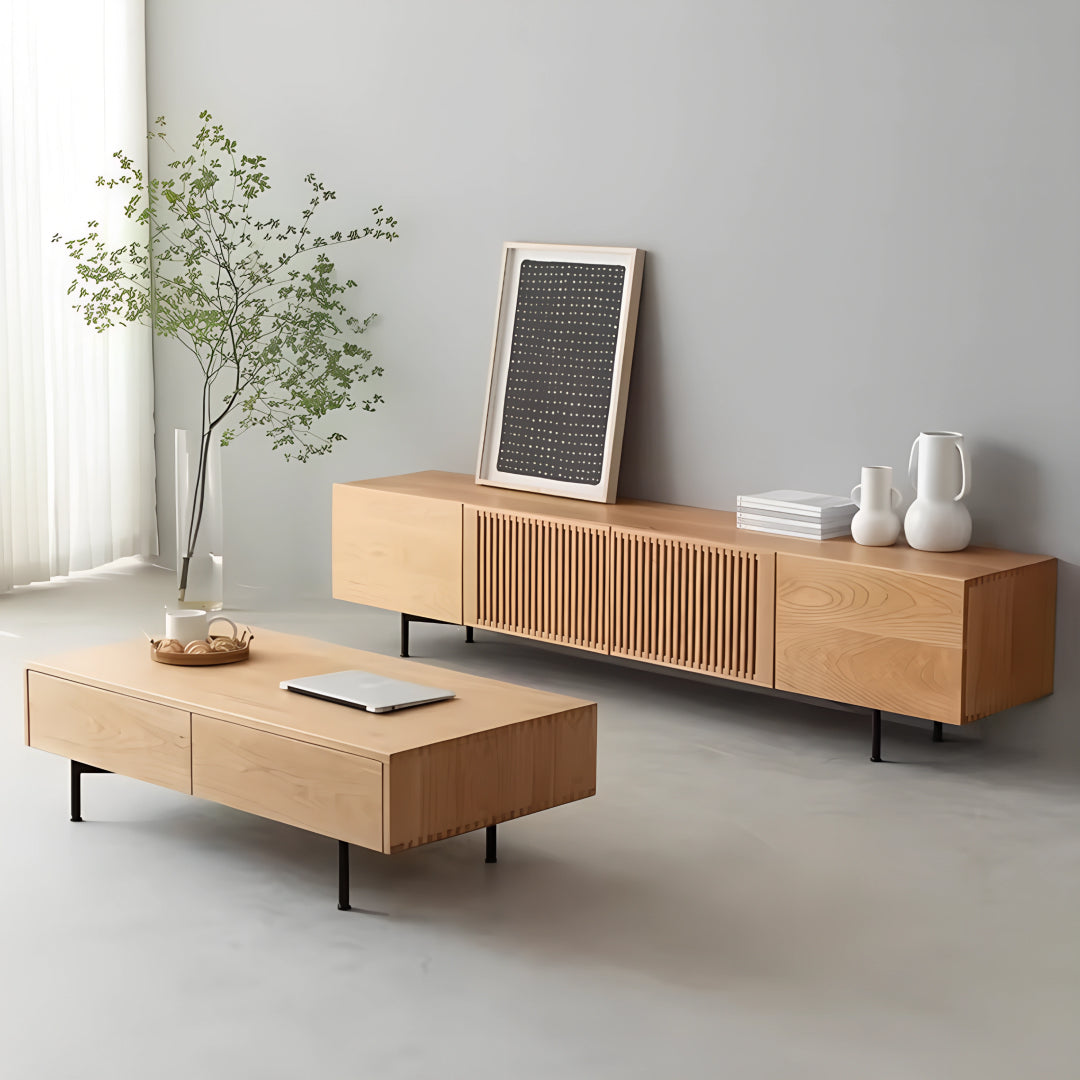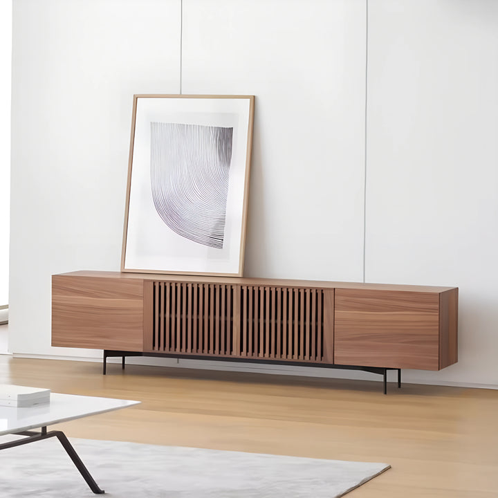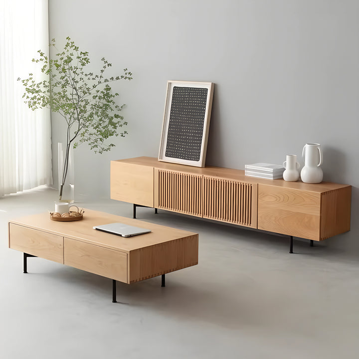 The Riva Media TV-table is a striking piece that effortlessly combines form and function. Constructed from high-quality plywood with solid wood drawers, it offers plenty of storage space while maintaining a sleek profile. The standout feature is its slatted wood front, which adds texture and elegance to the design, while the sturdy metal legs provide stability and a modern touch. Ideal for housing media equipment or decorative items, Riva brings a sophisticated yet natural element to any living room.
