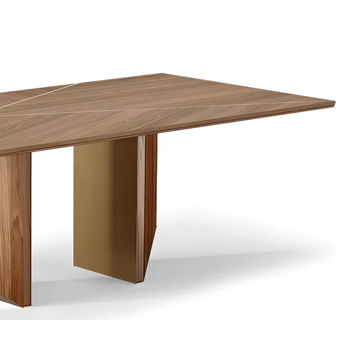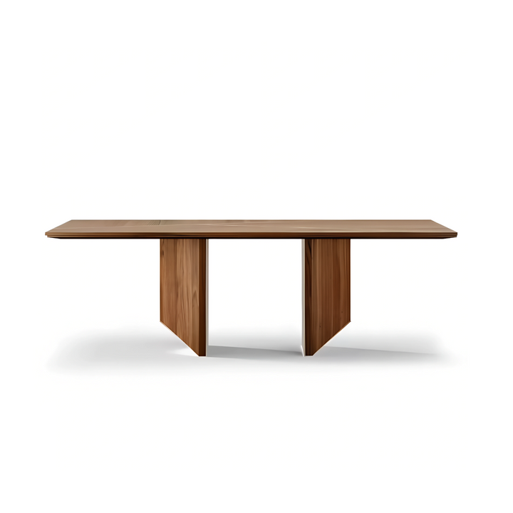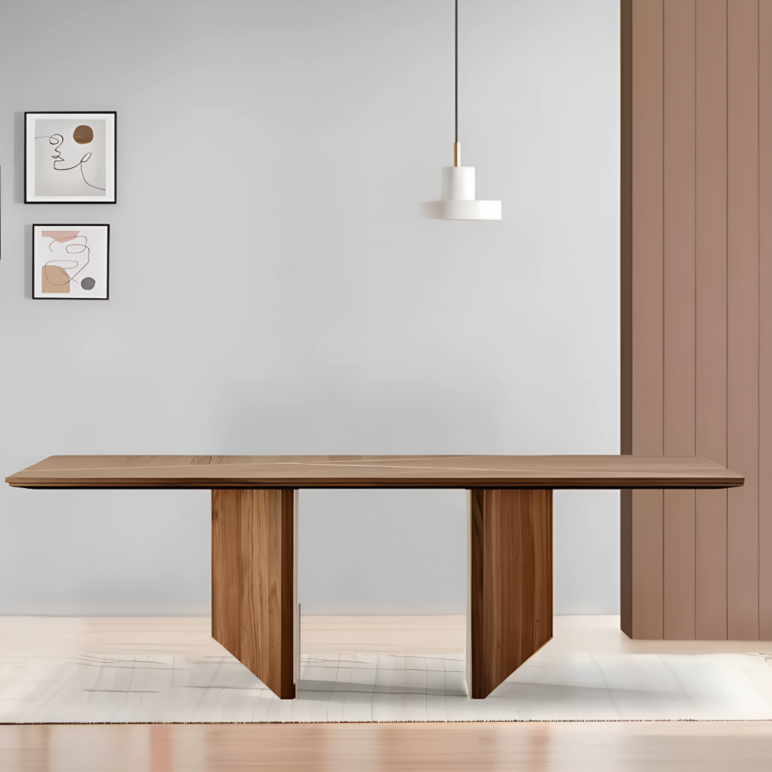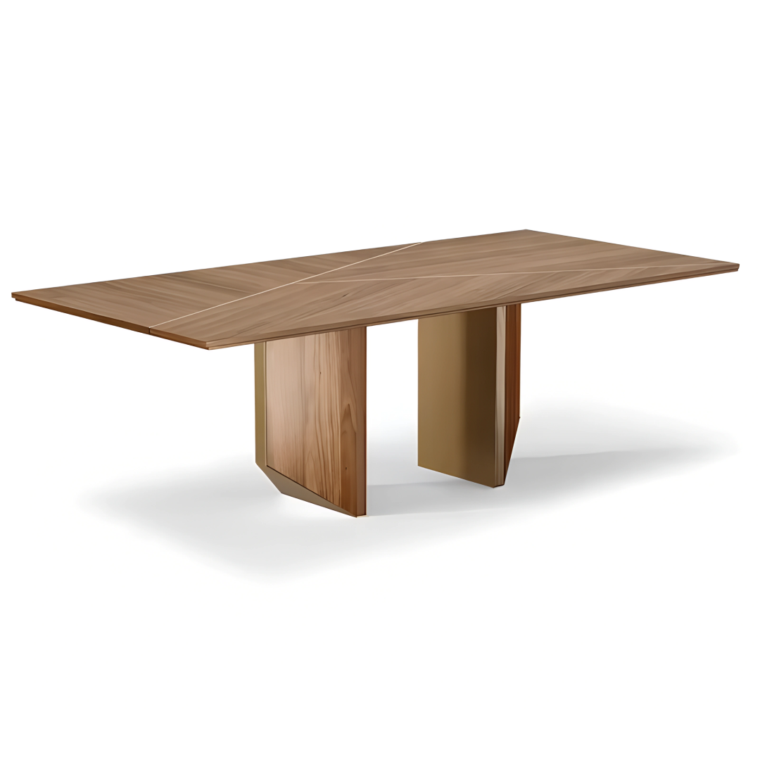 The Trave Table is a bold statement piece that combines minimalist design with natural materials. Its expansive plywood veneer top is supported by a unique, geometric solid wood base, offering both stability and visual interest. The clean lines and warm wood tones make it an ideal centerpiece for contemporary dining spaces. The stainless steel elements provide subtle reinforcement, adding durability while maintaining the table's refined aesthetic.