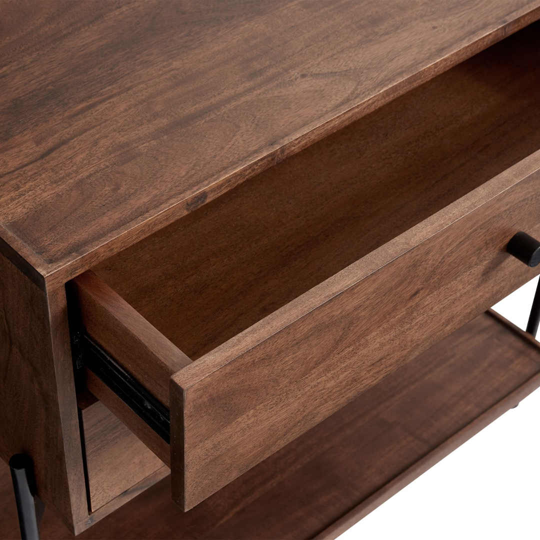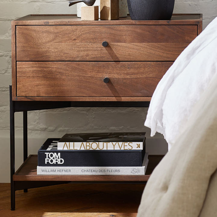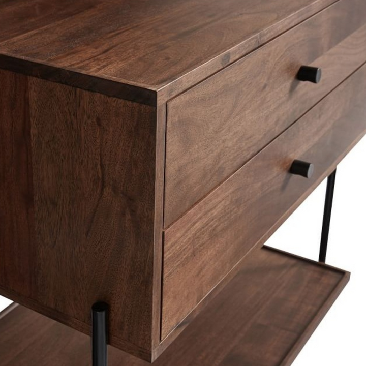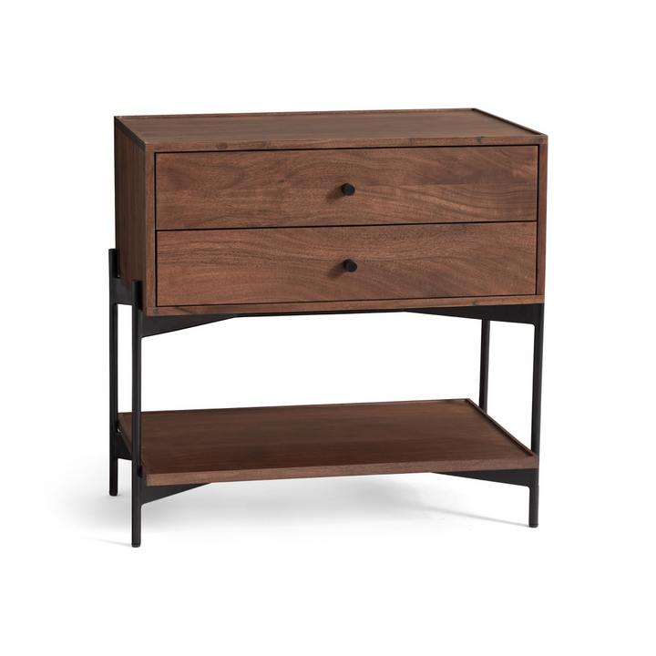 The Treviso Nightstand combines modern design with functionality, featuring two spacious drawers and a lower shelf for added storage. Its sleek lines, warm wood finish, and metal legs offer a refined yet sturdy aesthetic.